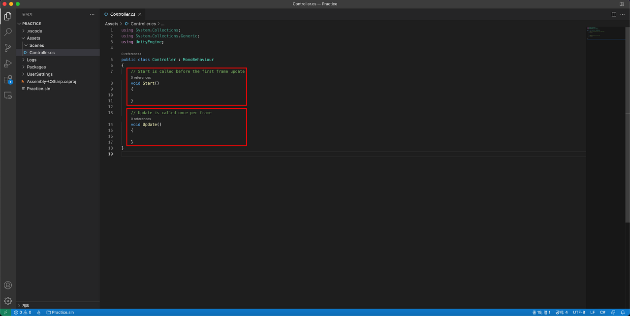 VSCode를 통해 스크립트를 열게 되면 우리가 이름 지었던 그대로 `Controller`라는 클래스가 있고 그 안에 `Start()`와 `Update()`라는 함수가 있다.▼