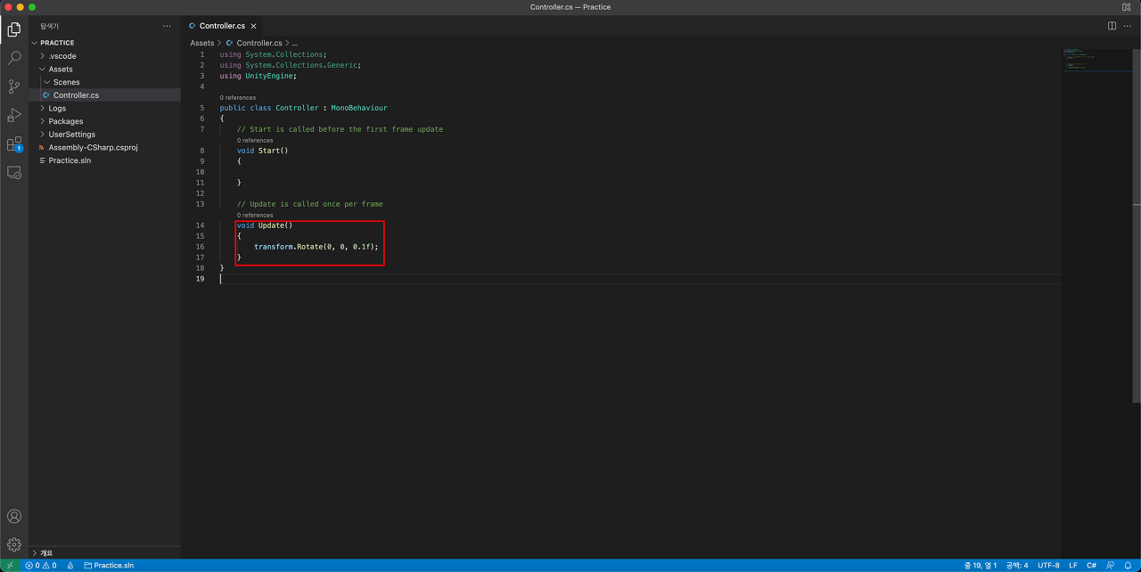 계속해서 회전 시키려면 `Update()`함수에 넣으면 되는데, 아마 위에 사용했던 코드 그대로 사용하게 되면 엄청난 속도로 회전할 것이다.▼