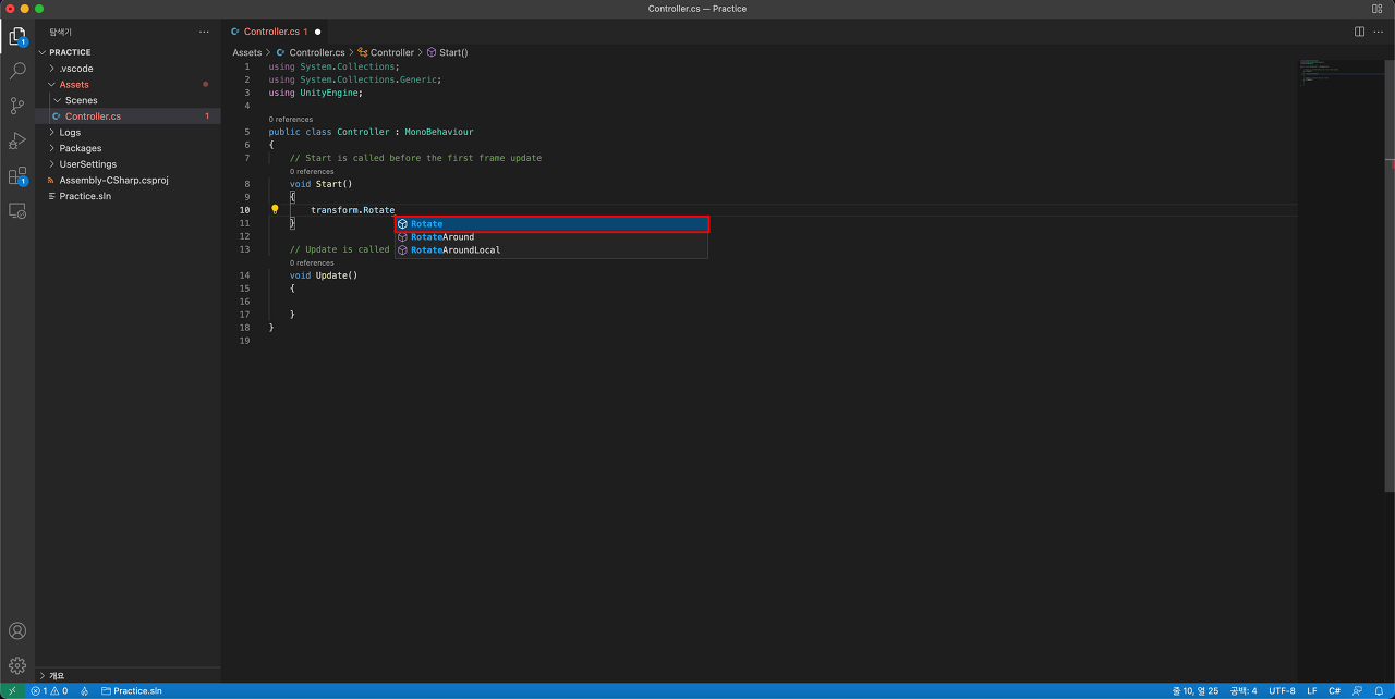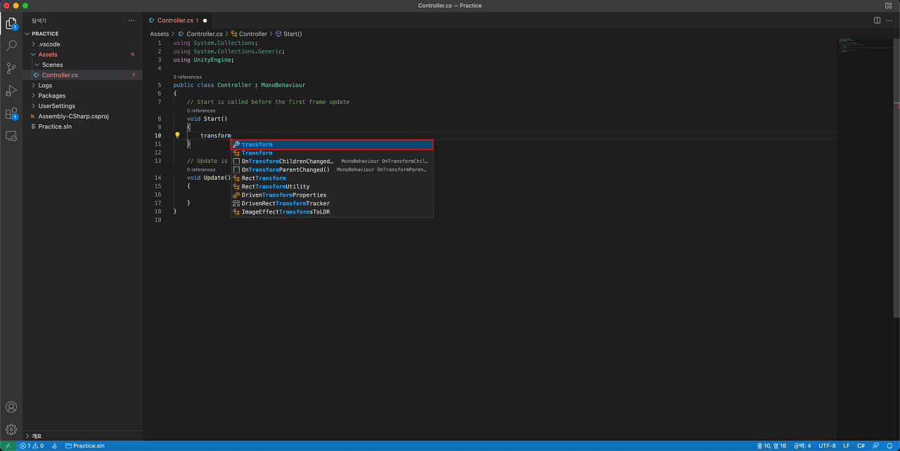 코드에서 오류가 감지 안됐다면 문법에 맞게 잘 작성한 것이니 Command(⌘) + S 로 저장하고 유니티로 돌아가자.