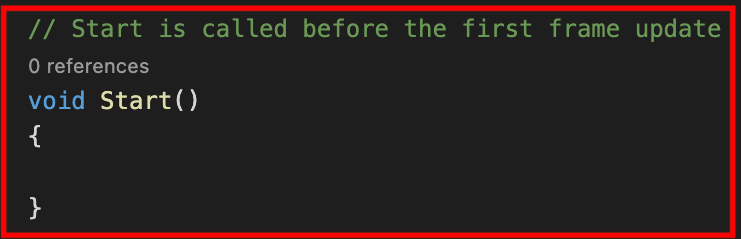 주석으로 적힌 설명 "Start is called before the first frame update"은 결국 가장 첫번째 프레임이 시작되기 전에 실행된다는 말은 무한 루프 이전에 실행된다는 의미이다.▼