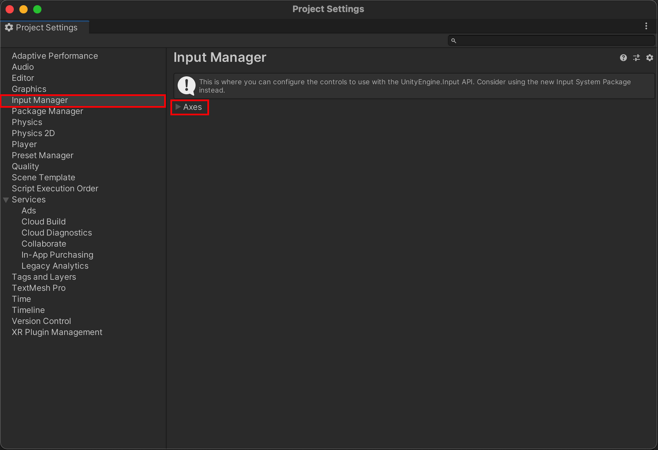 Input Manager 항목을 선택하면 Axes라고 토글이 하나 나온다. (Axes는 Axis의 복수형이다.)