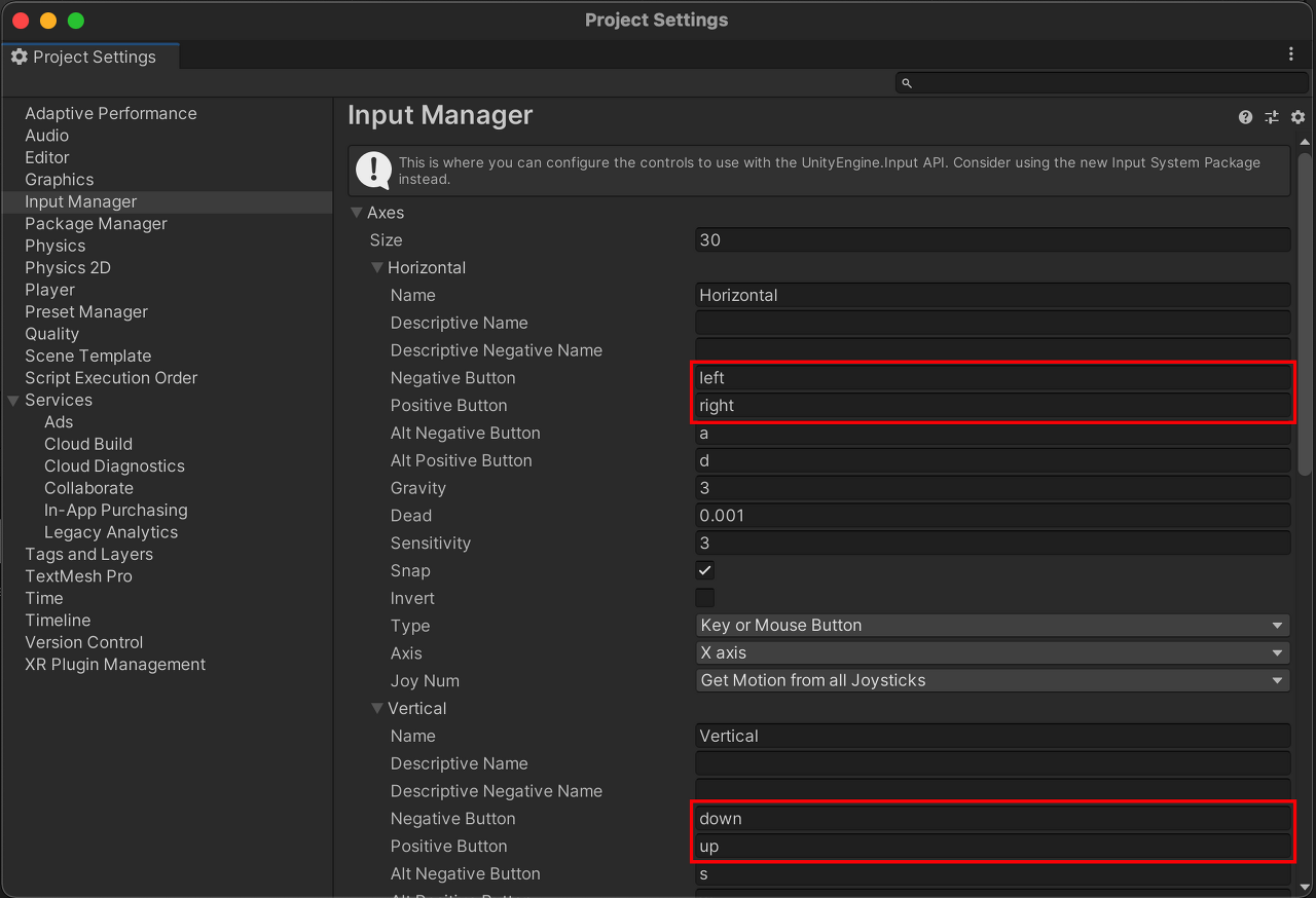 이를 열어서 Horizontal과 Vertical을 보면 Negative Button과 Positive Button이 있는데, 이것이 기본적으로 할당된 버튼을 의미한다.