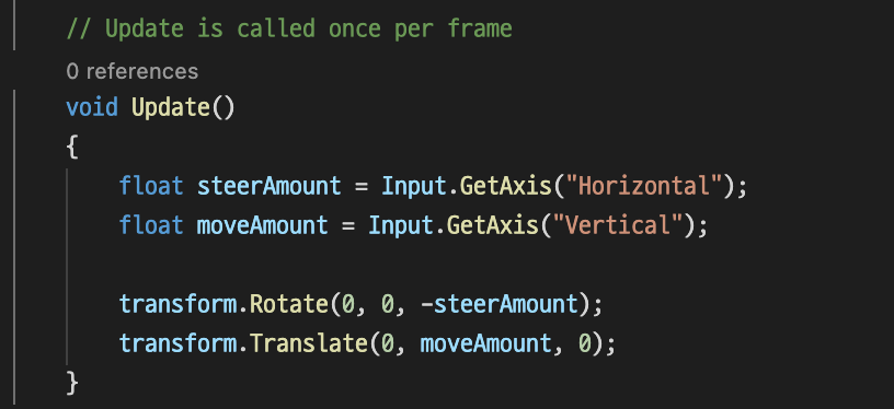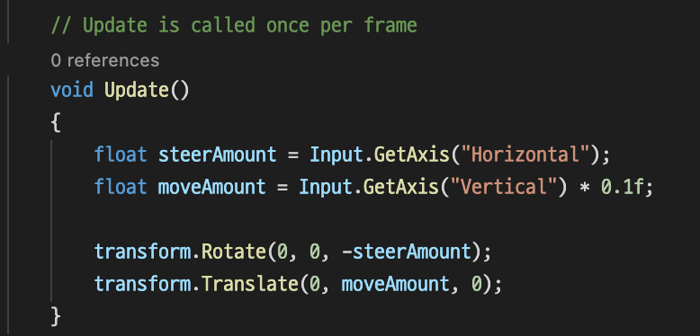 변수 이름은 뭐가 되어도 상관 없지만, `GetAxis()` 명령문은 아래와 같이 `Update()` 함수 블럭 안에 있어야한다. ▼