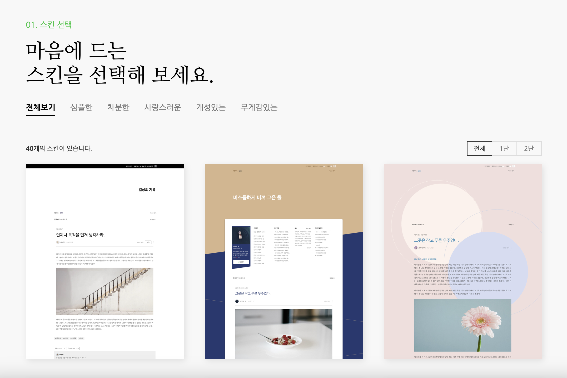 기본 제공 서비스라고 하면 스킨(테마)과 위젯을 이야기할 수 있다. 네이버 블로그는 수많은 스킨을 지원하기에 원하는 대로 블로그를 꾸밀 수 있다. 가입을 하면 아래의 사진과 같이 기본 제공 스킨을 고를 수 있다.
