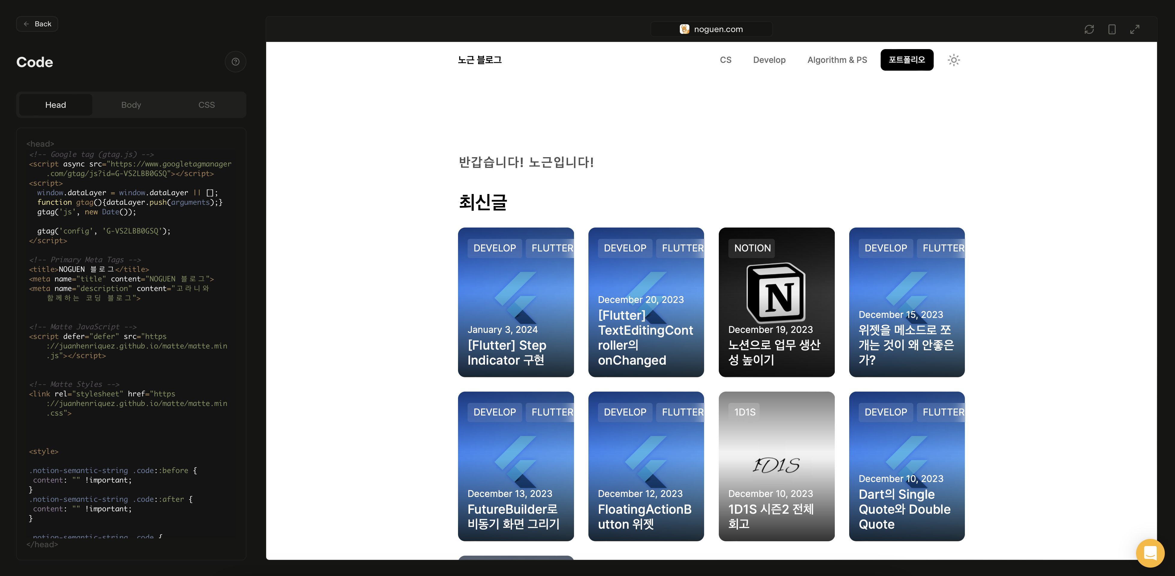 티스토리와 같이 HTML과 CSS를 설정할 수 있다. 우피의 경우에는 HTML만 있고 CSS는 없는데, super.so는 CSS도 제공해준다. Super.so같은 경우에는 커뮤니티도 잘되어있어 JS를 통해 제공되는 테마를 사용하여 완전히 다른 레이아웃을 구성하는 것도 가능하다.