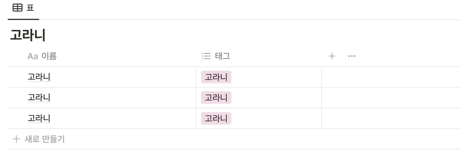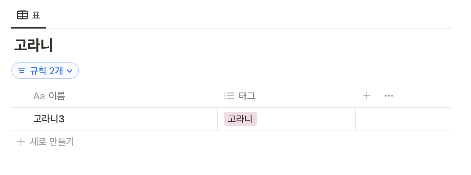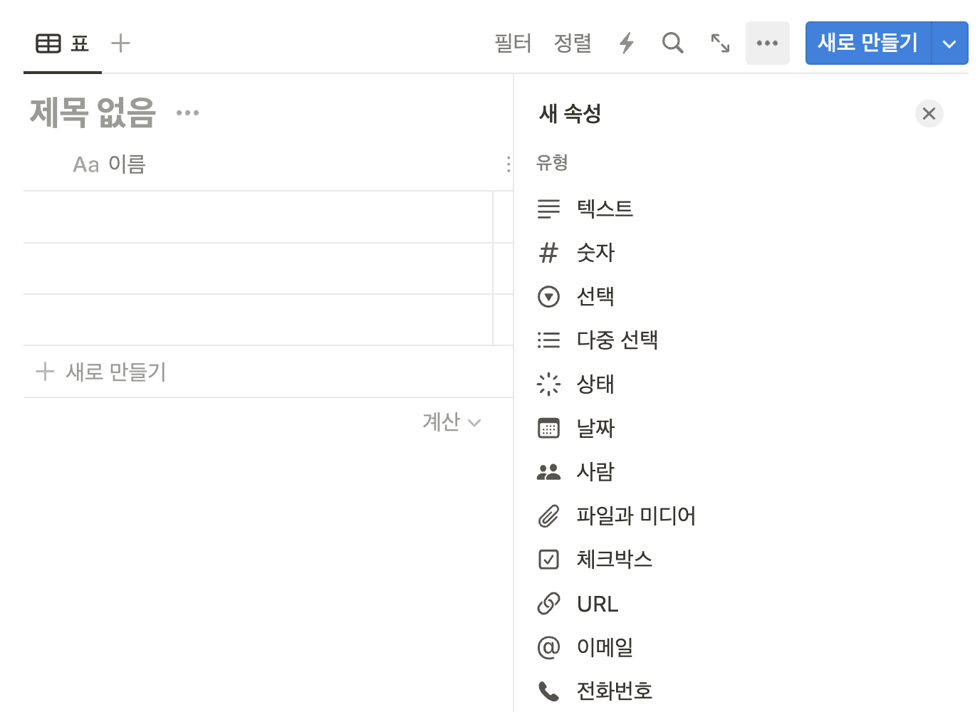 노션에서 기본적으로 제공하는 것은 이 3가지이며, 이 중 이름 칸을 빼고는 나머지는 자유롭게 다른 형식으로 바꿀 수 있다.