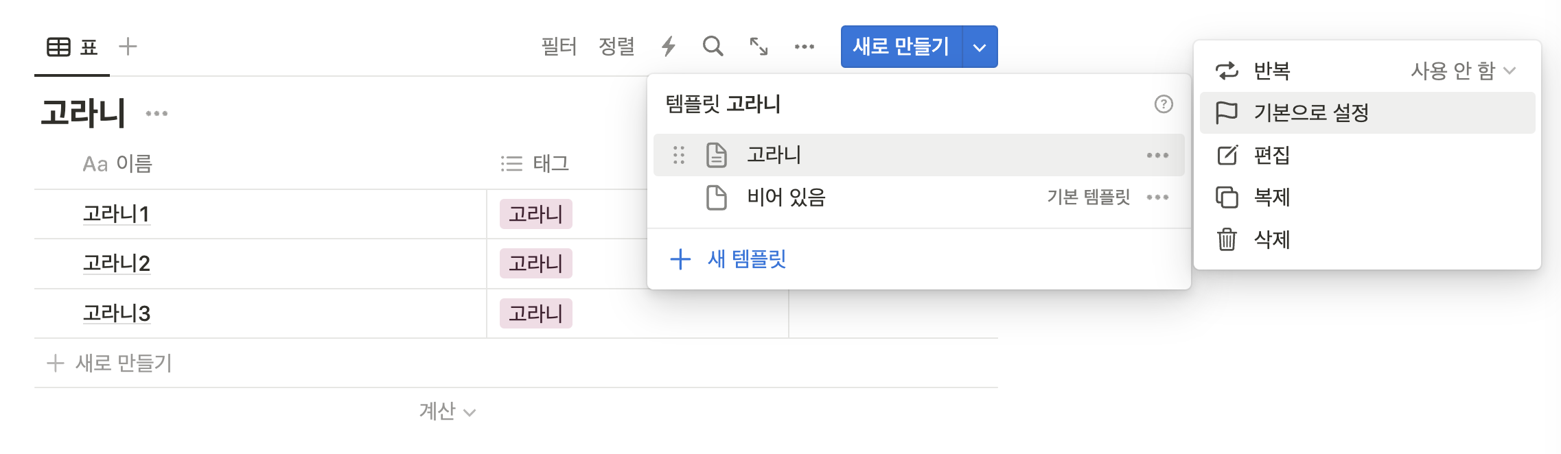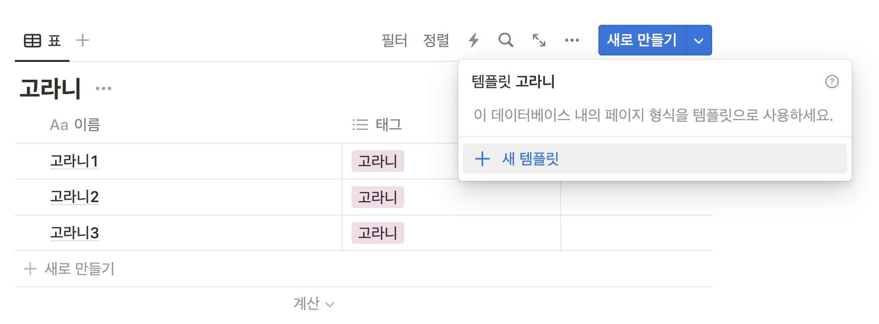 데이터베이스 오른쪽 위에 새로 만들기의 토글을 열면 새 템플릿을 생성하는 버튼이 있다. ▼