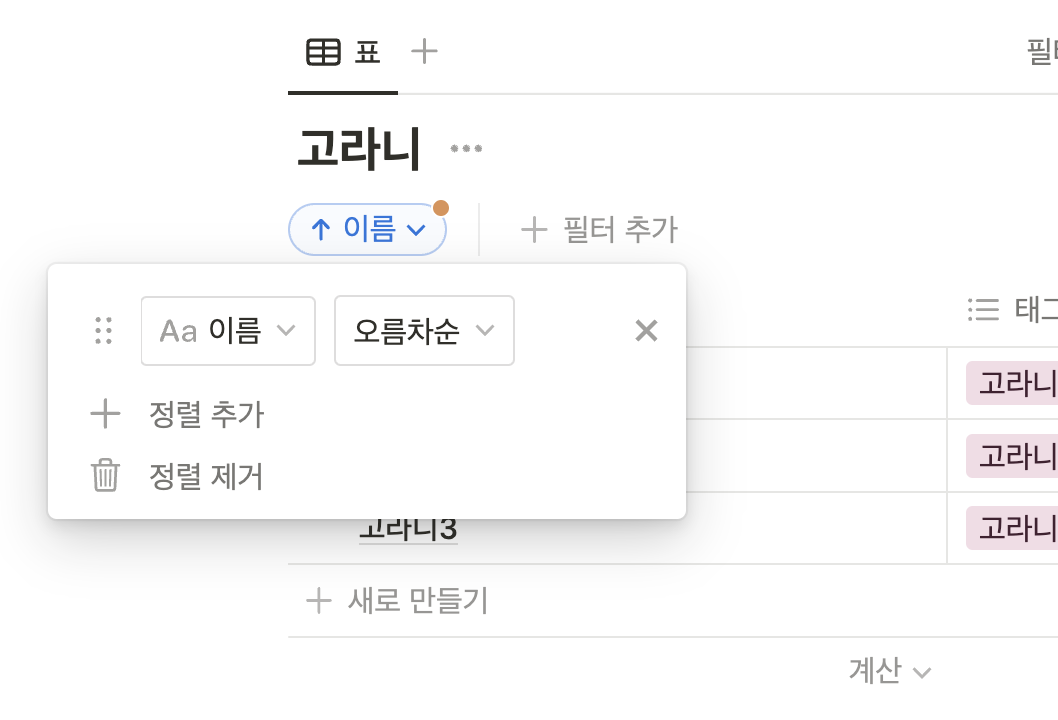 데이터베이스의 상단부에 정렬버튼을 누르면, 데이터베이스 속성들의 목록이 나온다. ▼