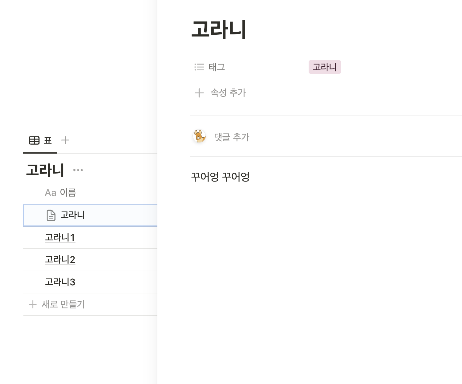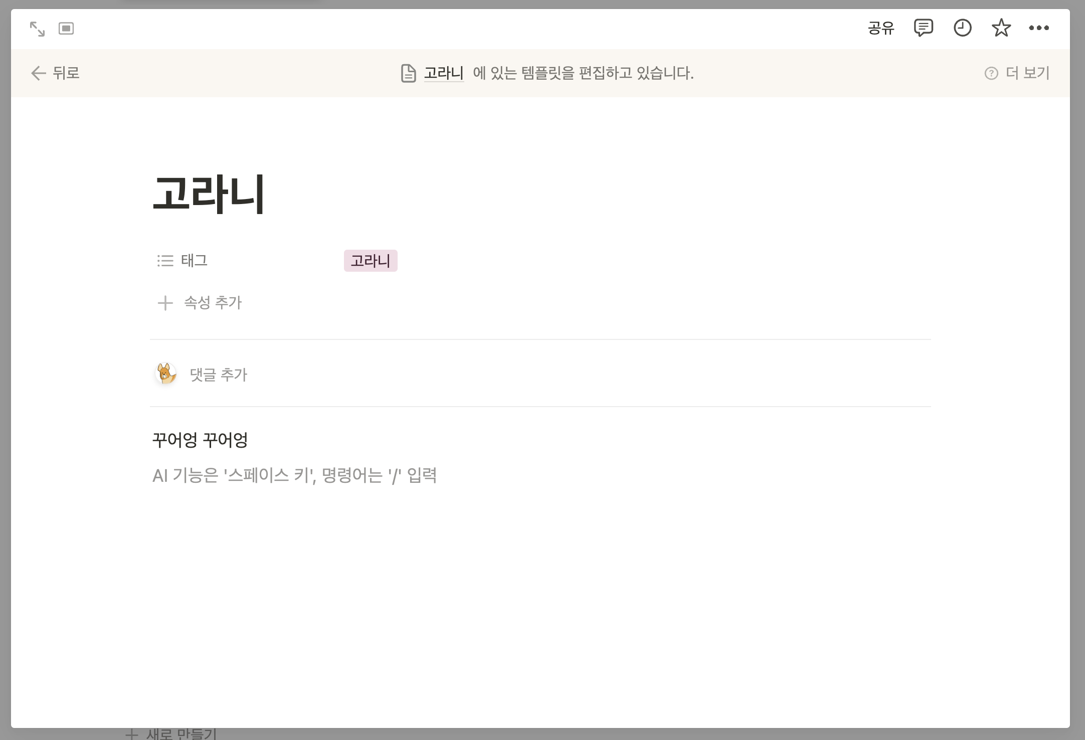 템플릿 제작이 끝나고 다시 토글을 열면 고라니 템플릿이 있다.