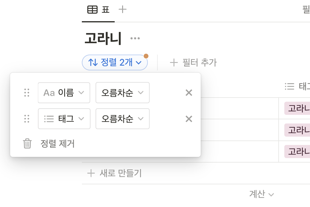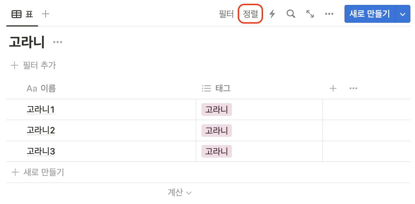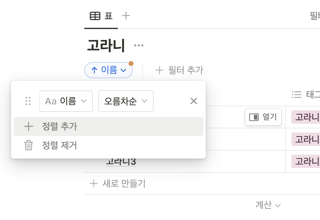 데이터베이스의 상단부에 정렬버튼을 누르면, 데이터베이스 속성들의 목록이 나온다. ▼