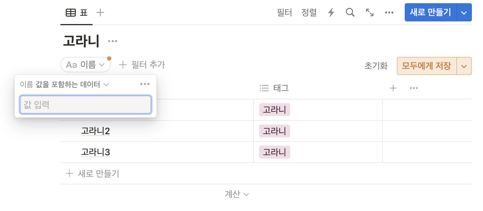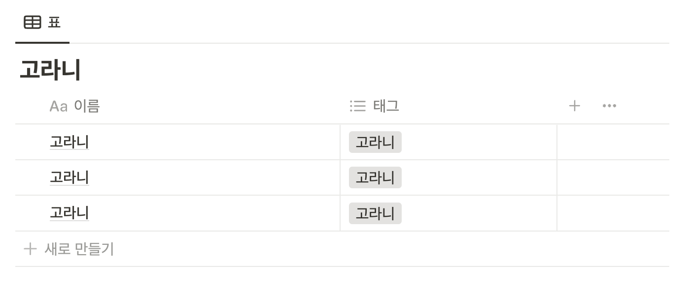 노션에서 기본적으로 제공하는 것은 이 3가지이며, 이 중 이름 칸을 빼고는 나머지는 자유롭게 다른 형식으로 바꿀 수 있다.
