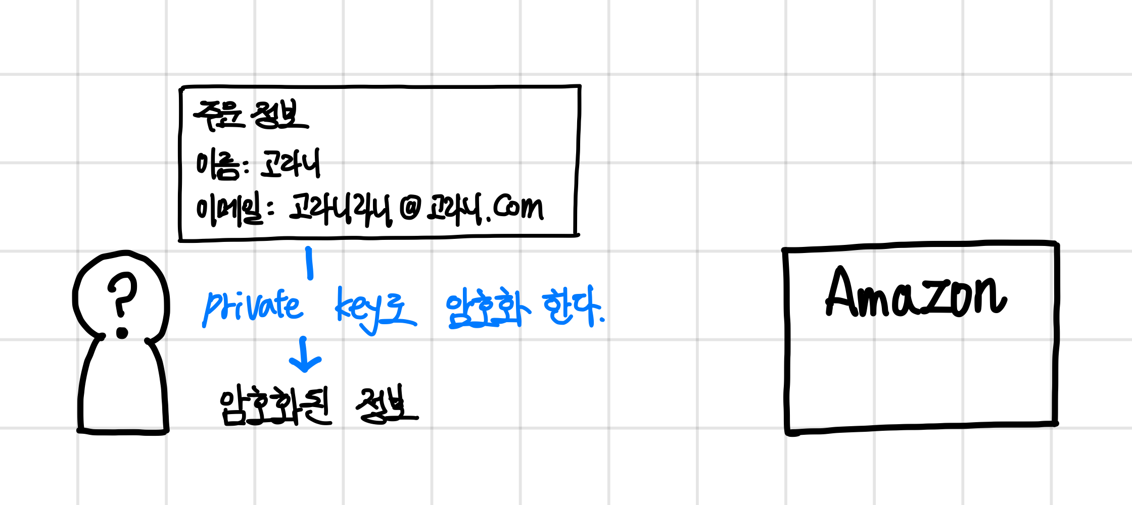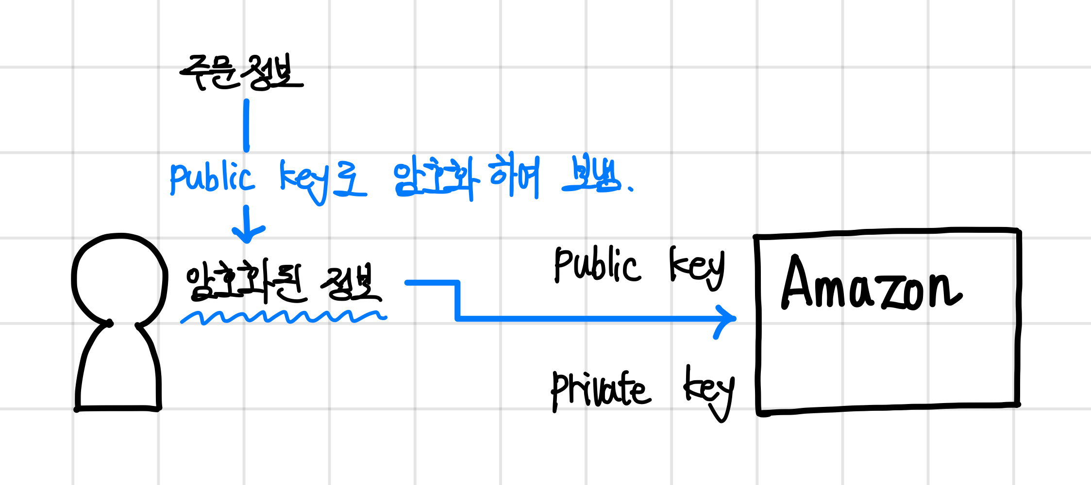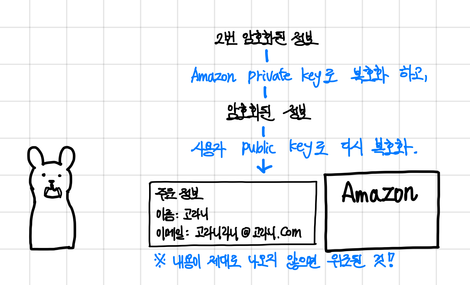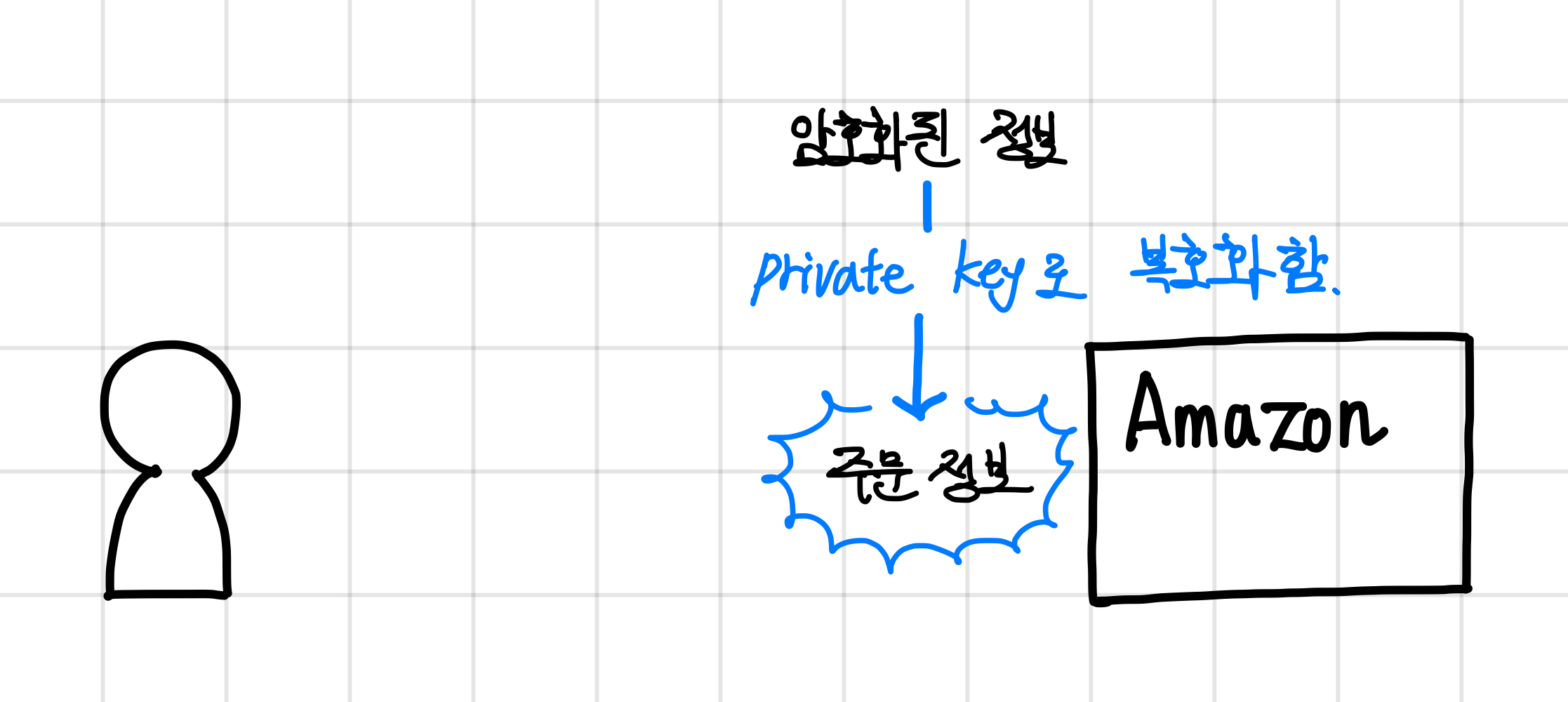 아마존은 사용자가 보낸 암호화된 정보를 스스로가 갖고 있던 private key로 복호화 하여 안전하게 주문 정보를 받아온다.▼