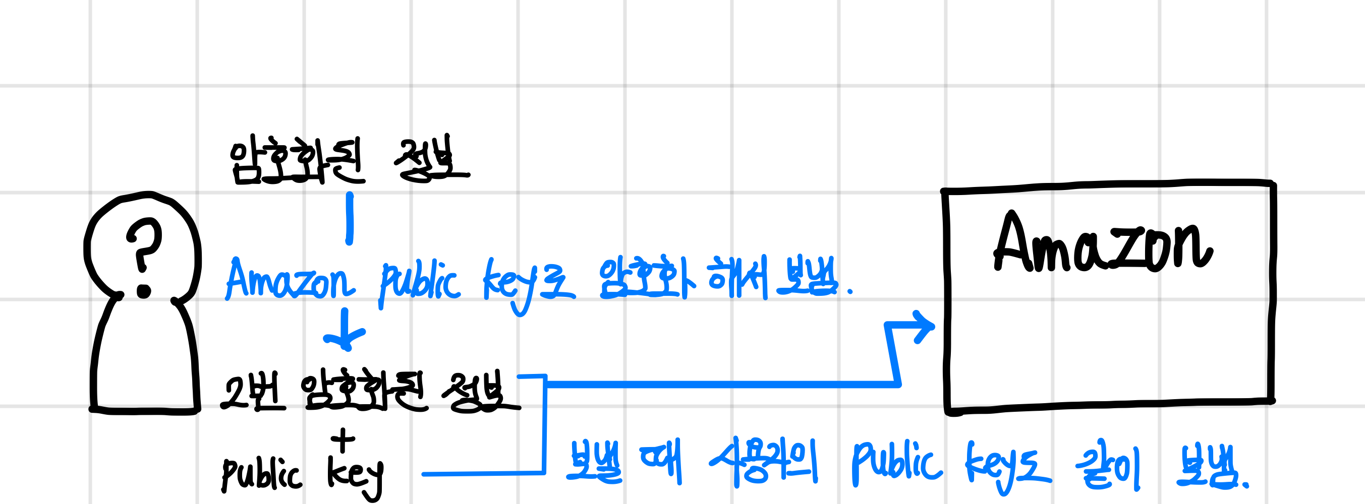 아마존이 보낸 public key를 토대로 사용자는 보낼 정보를 암호화하고, 암호화된 내용을 아마존에게 건네준다.▼