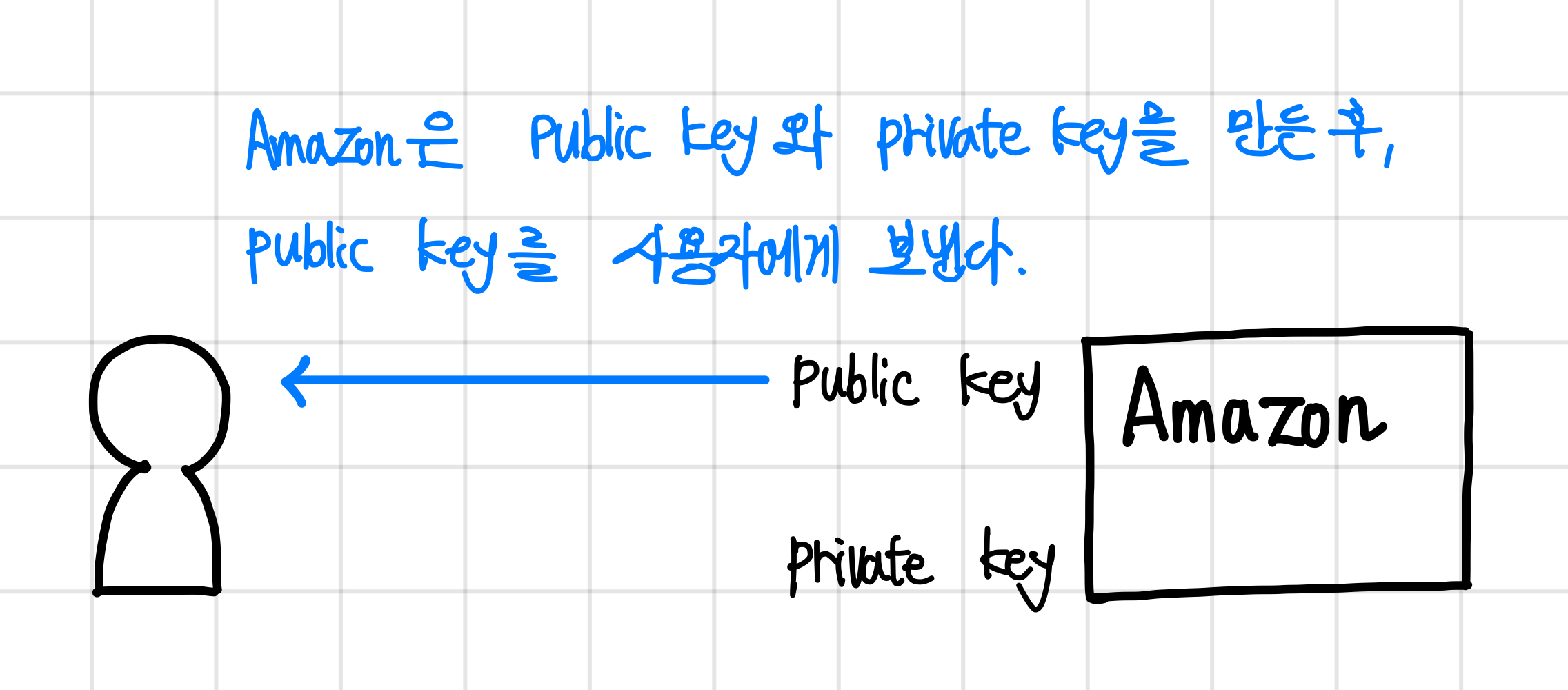 아마존은 암호화를 해주는 public key와 이를 복호화 해주는 private key를 만든 후, public key를 사용자들에게 전송한다.▼