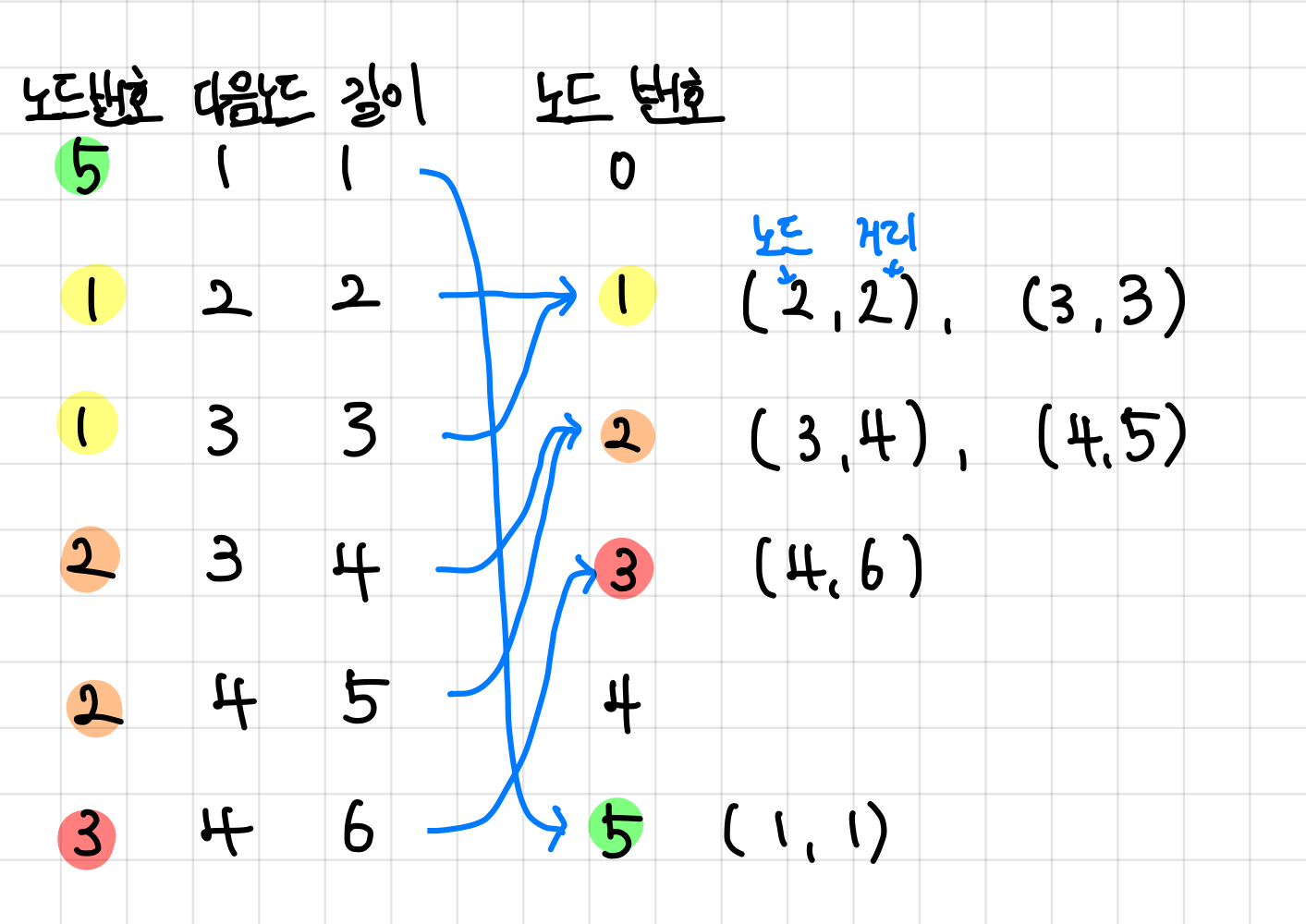가장 앞의 5번 노드의 칸으로 가서 다음에 갈 노드 정보를 1로, 그리고 그 길이는 1로 저장해준다.