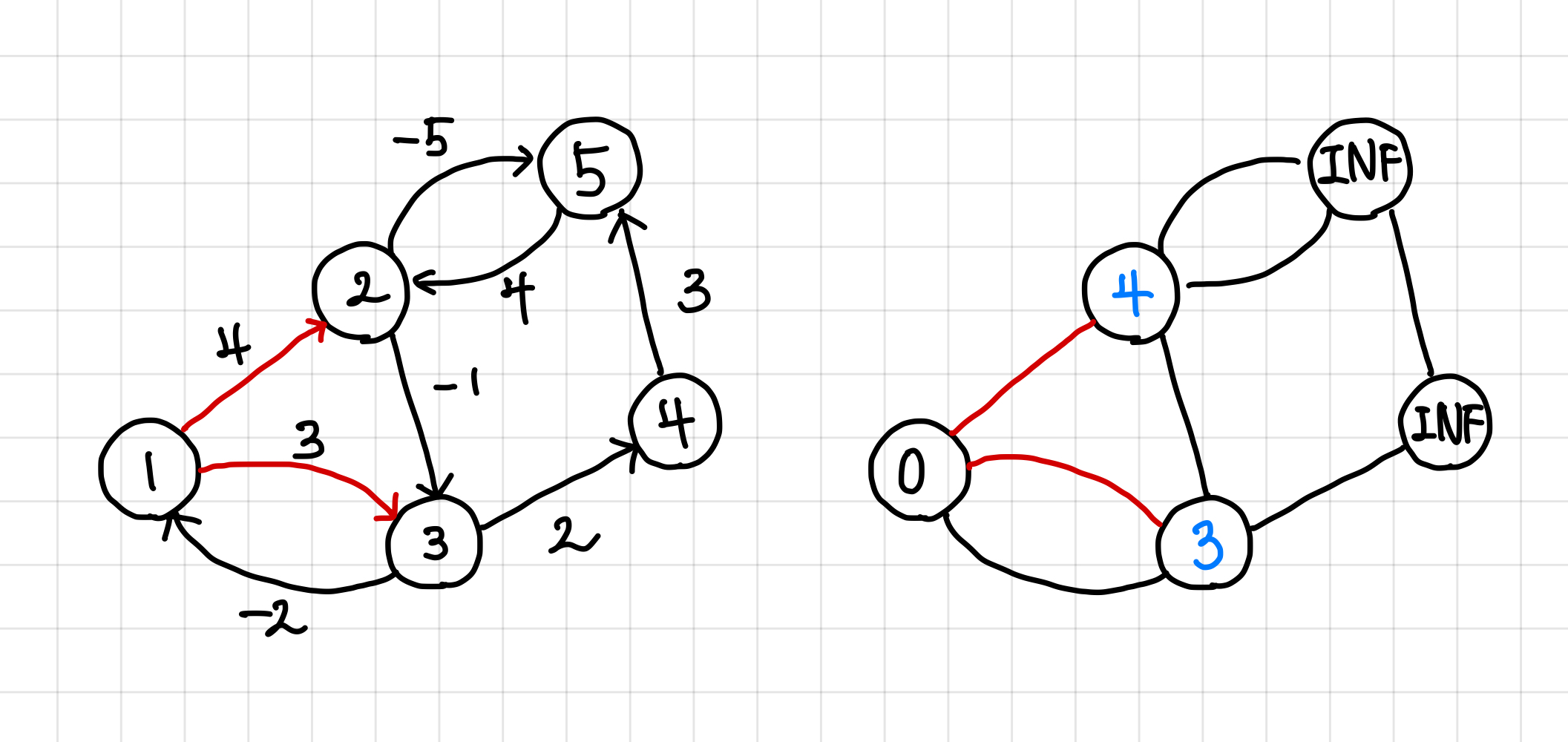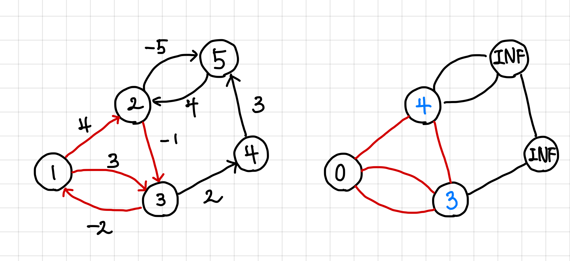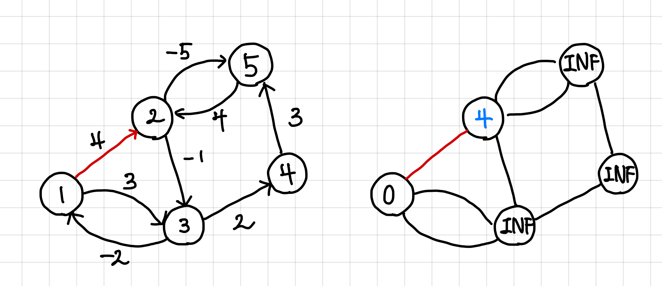 왼쪽은 간선이 표시된 그래프이고, 오른쪽은 최단 거리를 표시할 그래프이다.