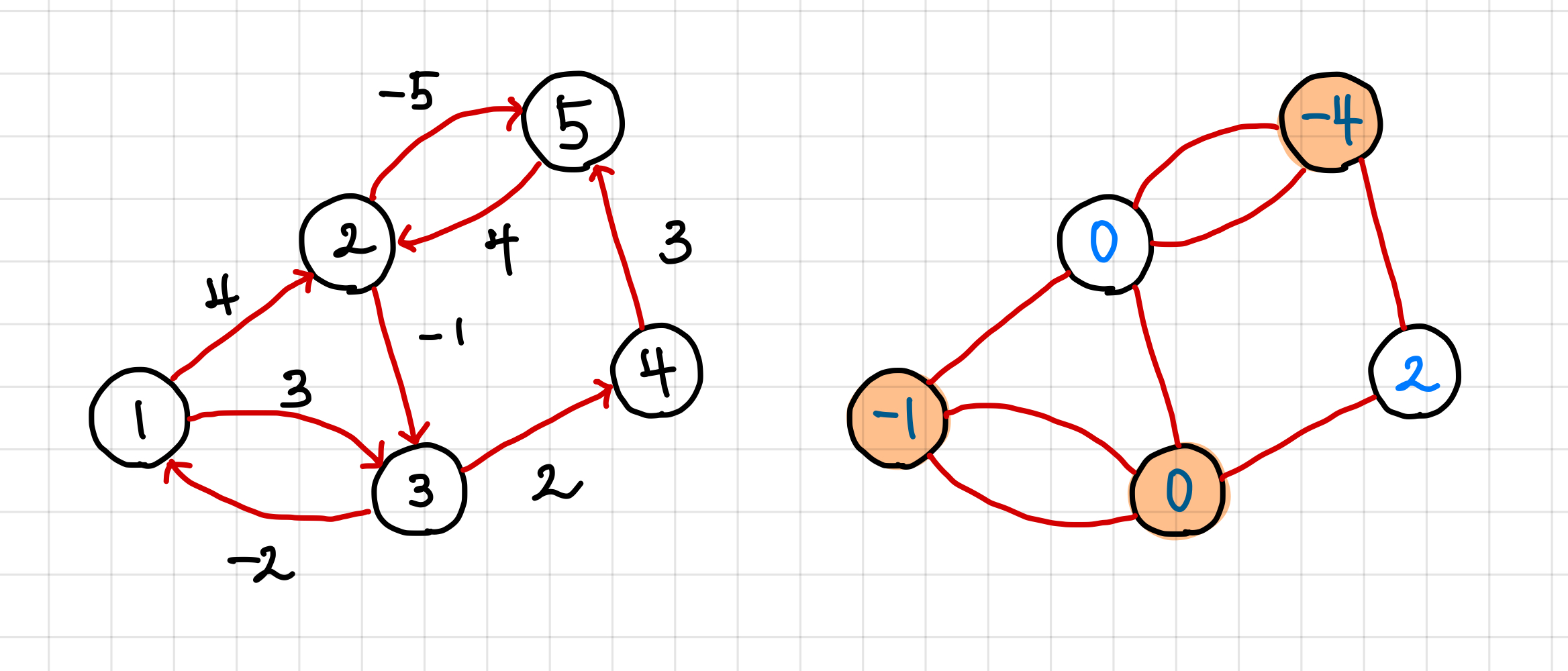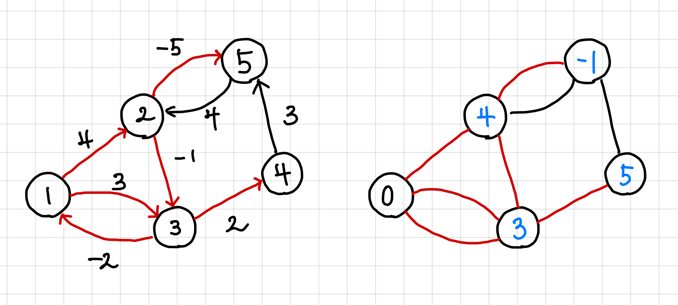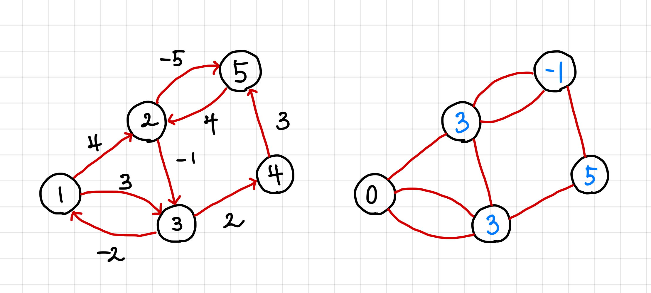 왼쪽은 간선이 표시된 그래프이고, 오른쪽은 최단 거리를 표시할 그래프이다.