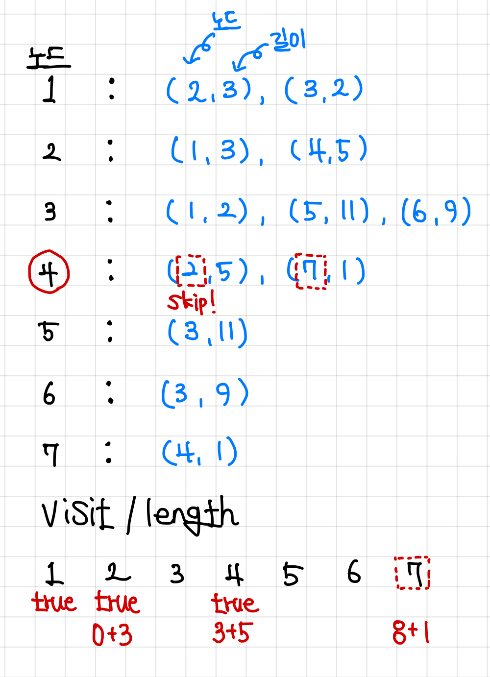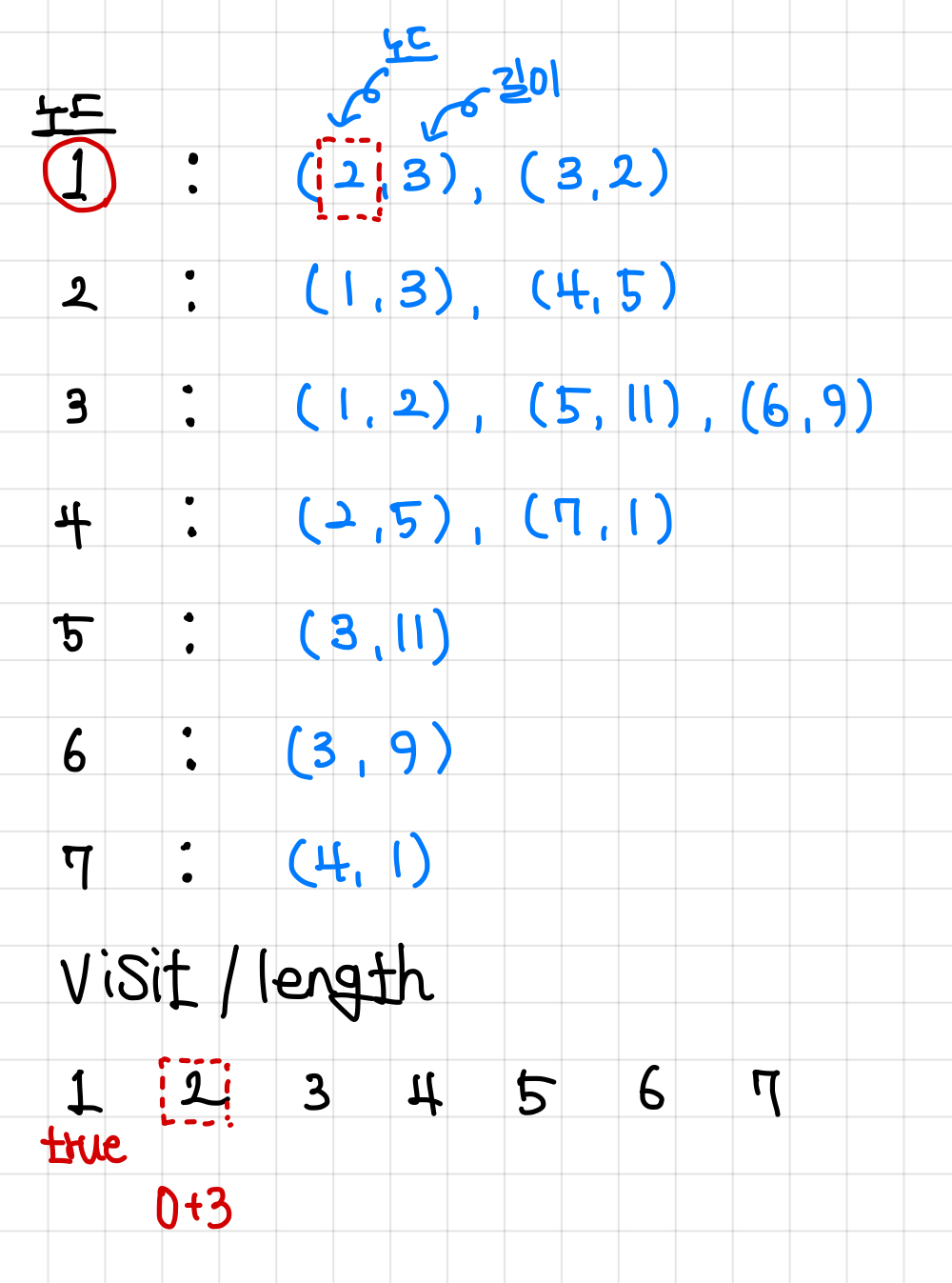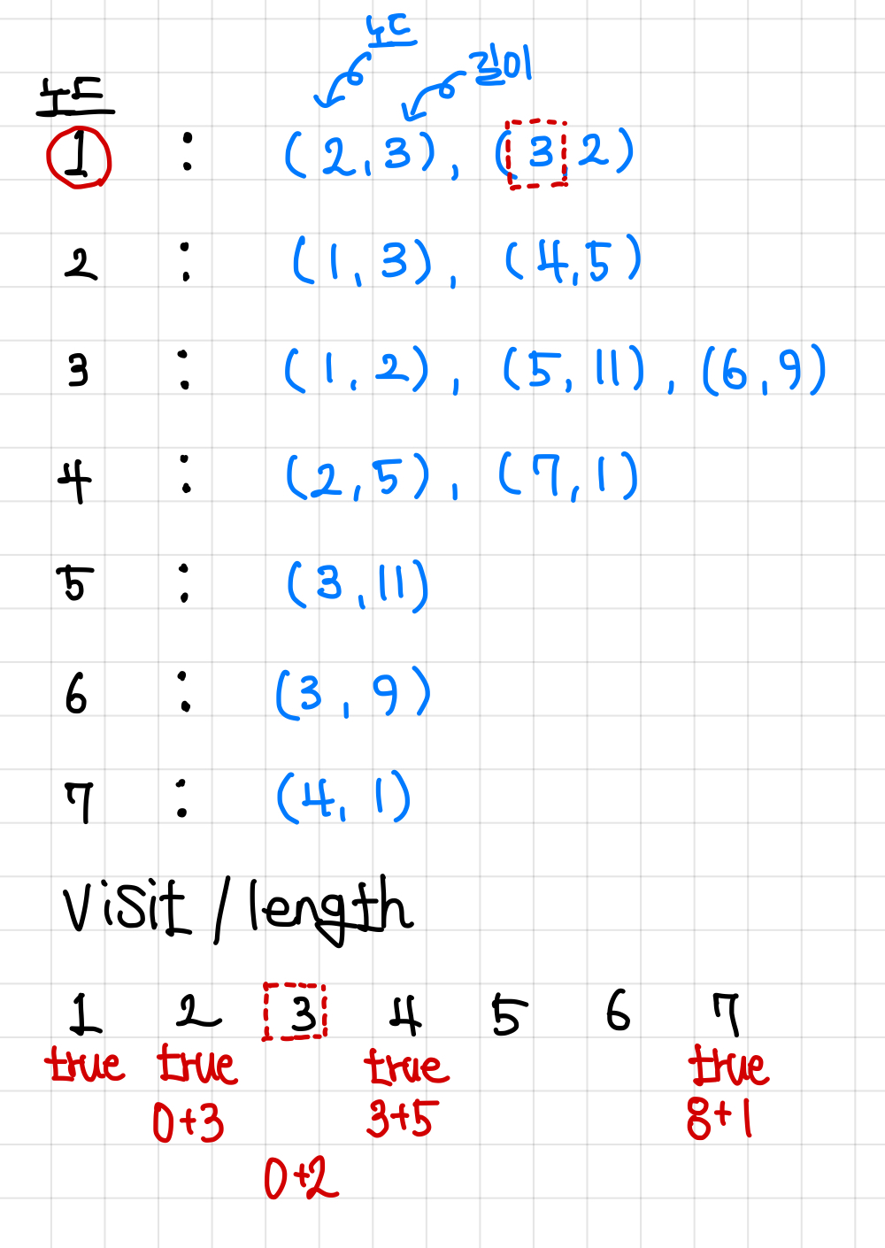 노드 2에는 방문한 적이 없으므로 노드 2를 다음 방문 노드로 정하고, length에 노드 1과 2 사이의 거리인 3을 더해준다.▼
