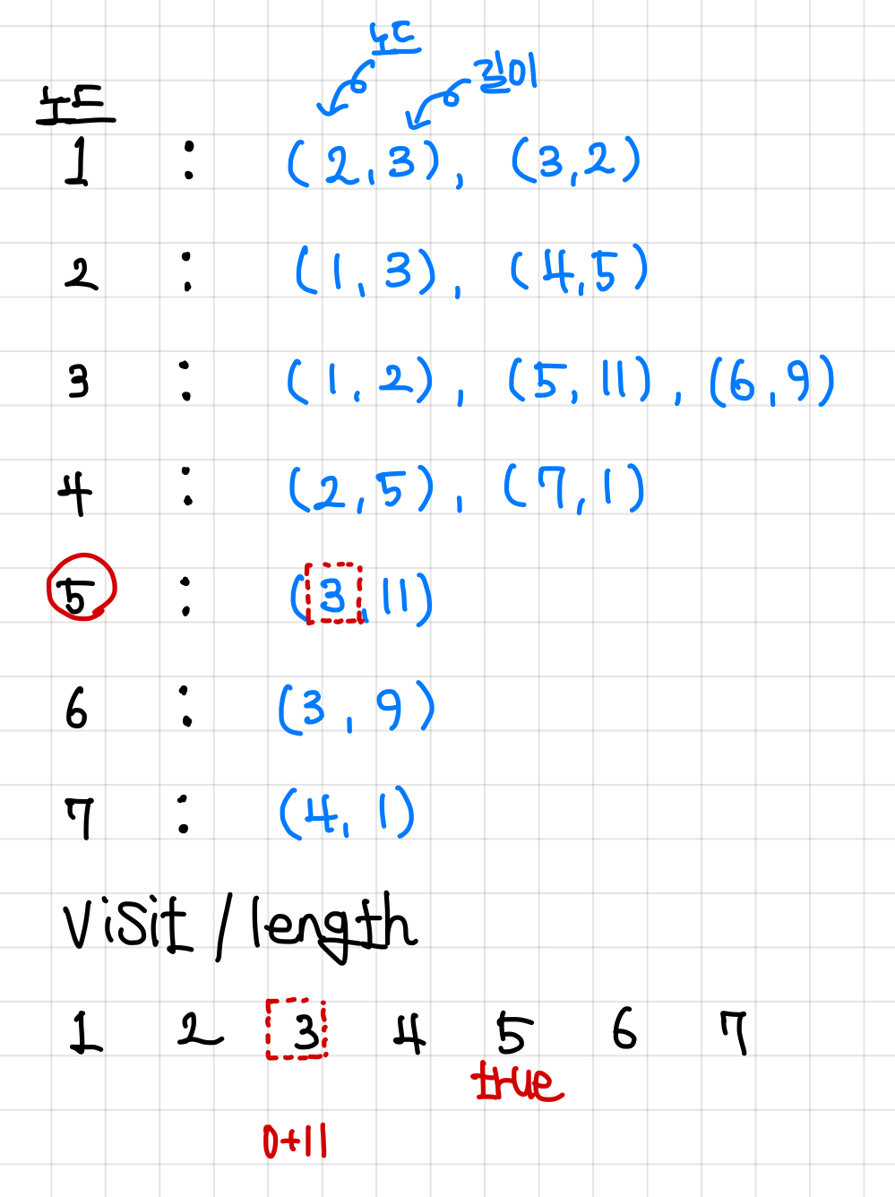 노드 2에는 방문한 적이 없으므로 노드 2를 다음 방문 노드로 정하고, length에 노드 1과 2 사이의 거리인 3을 더해준다.▼