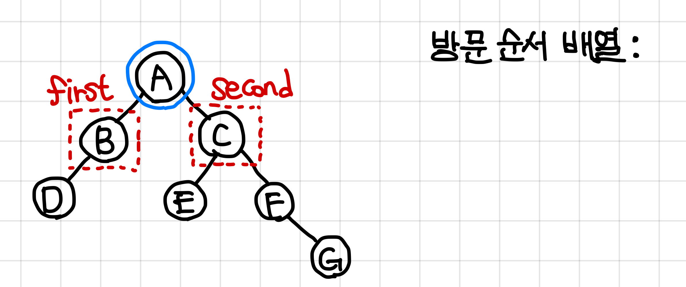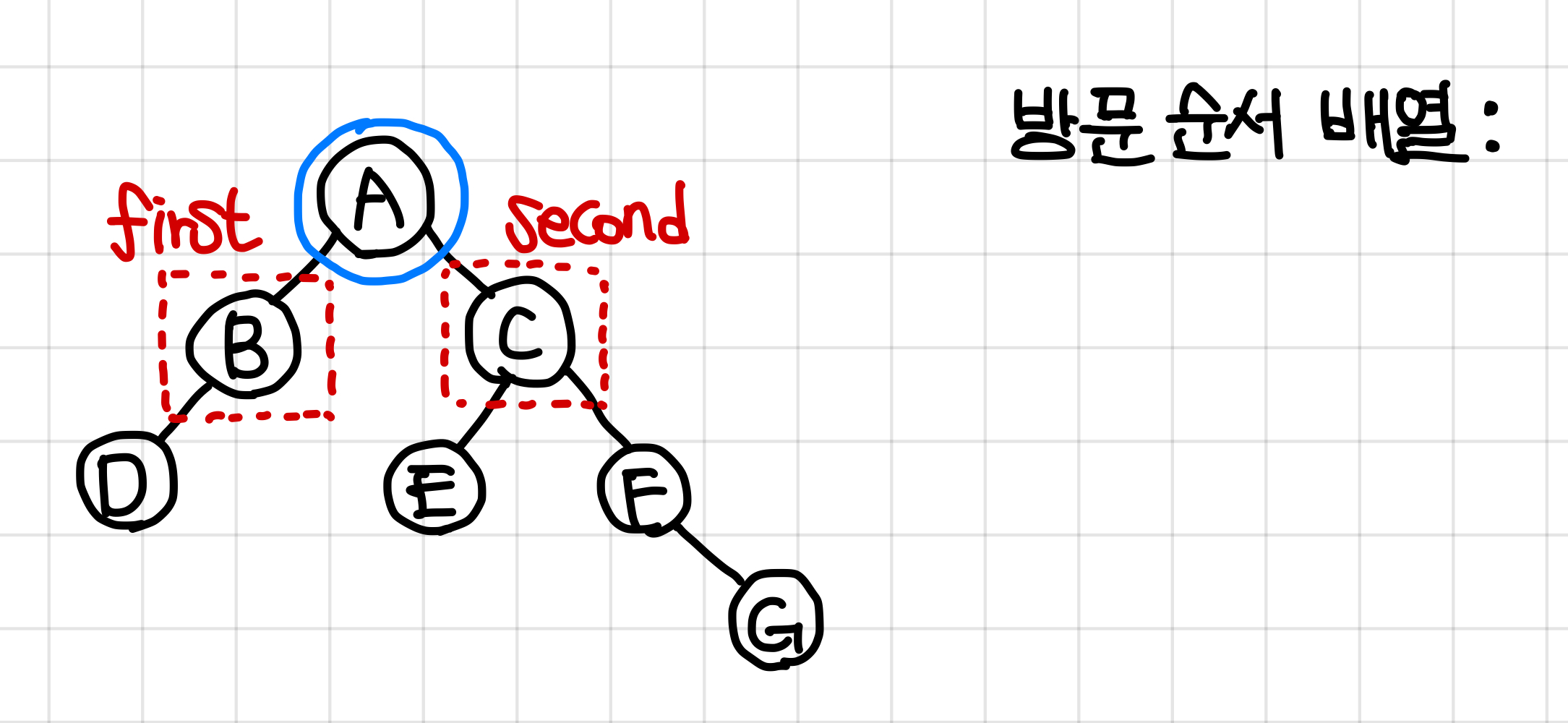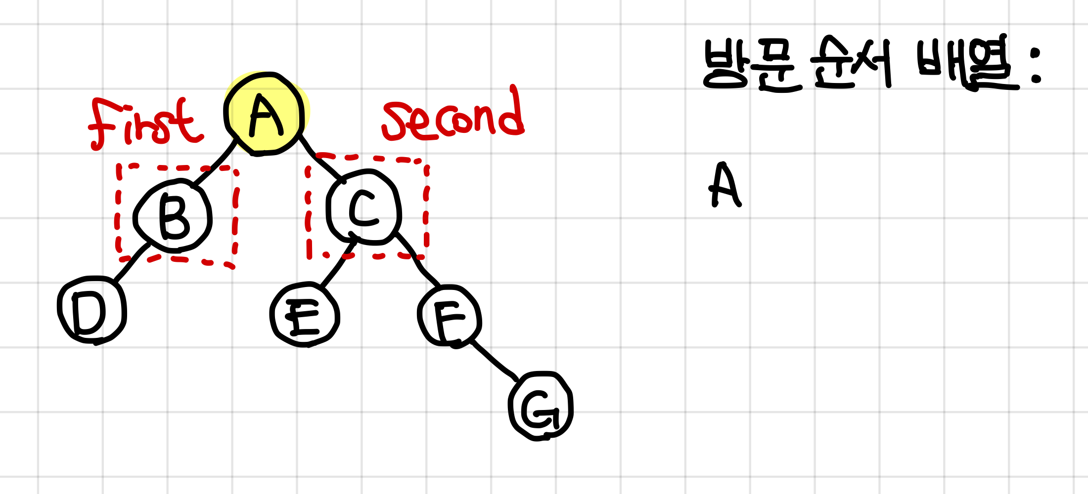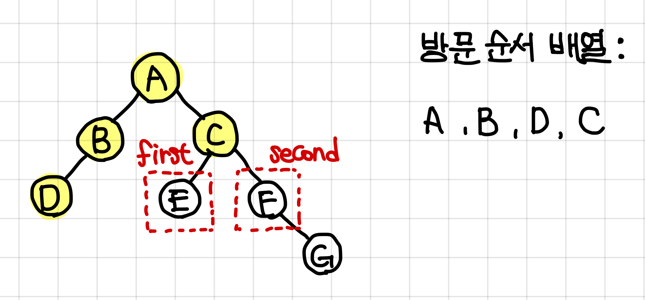2. 왼쪽 부터 방문하기로 했으므로 A값은 왼쪽 dfs가 전부 끝나고 방문 순서 배열에 들어간다.