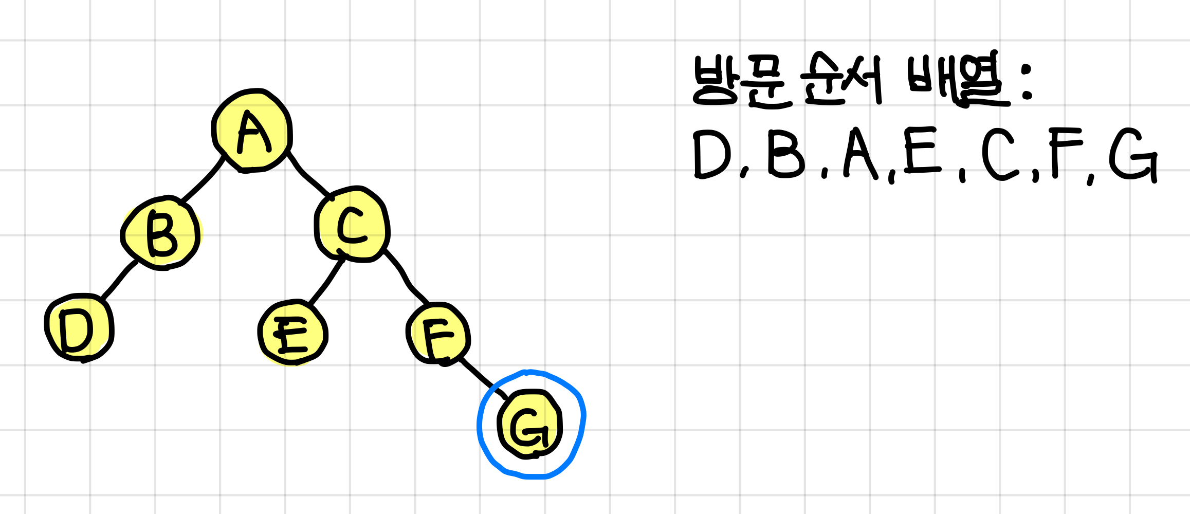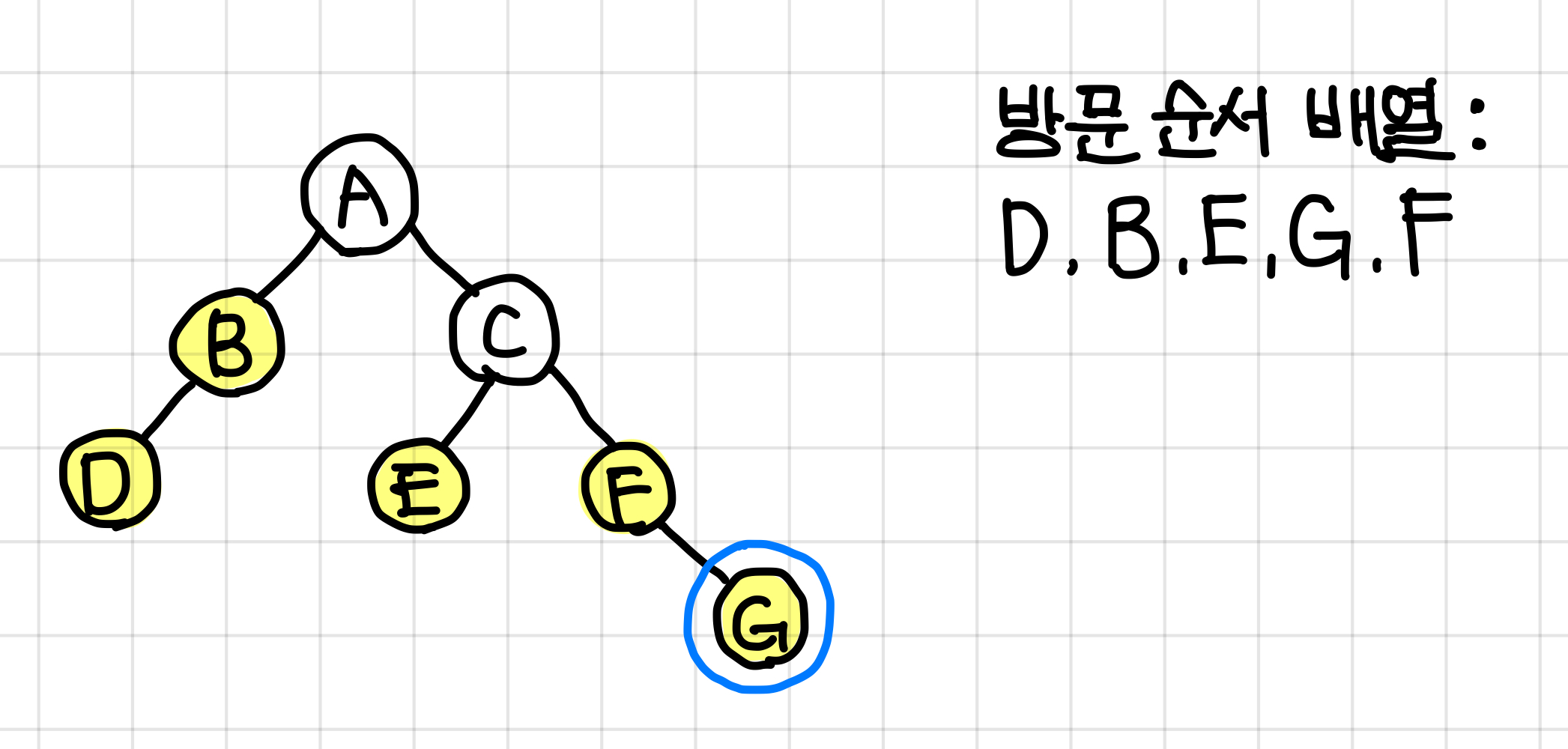 - 중위 순회한 결과 : DBAECFG // (왼쪽 자식) (루트) (오른쪽 자식)