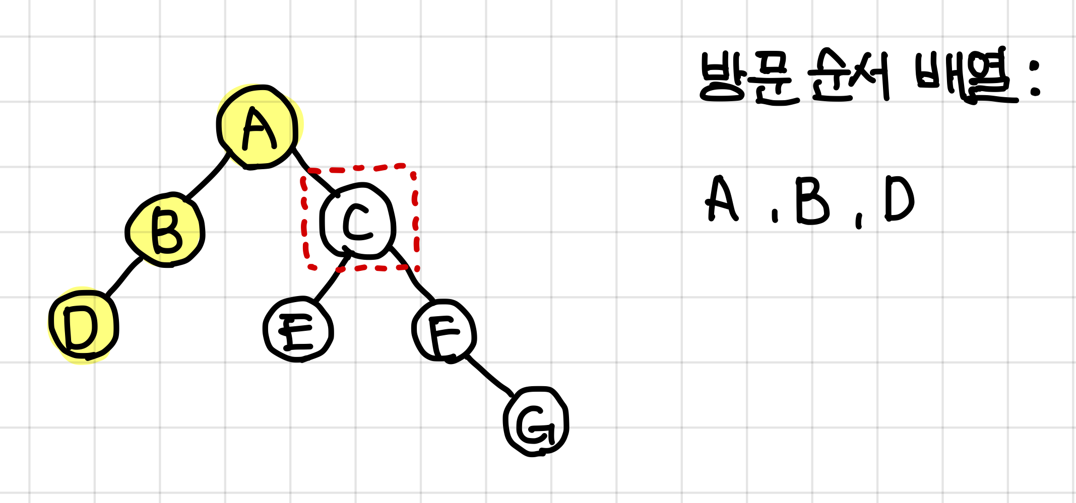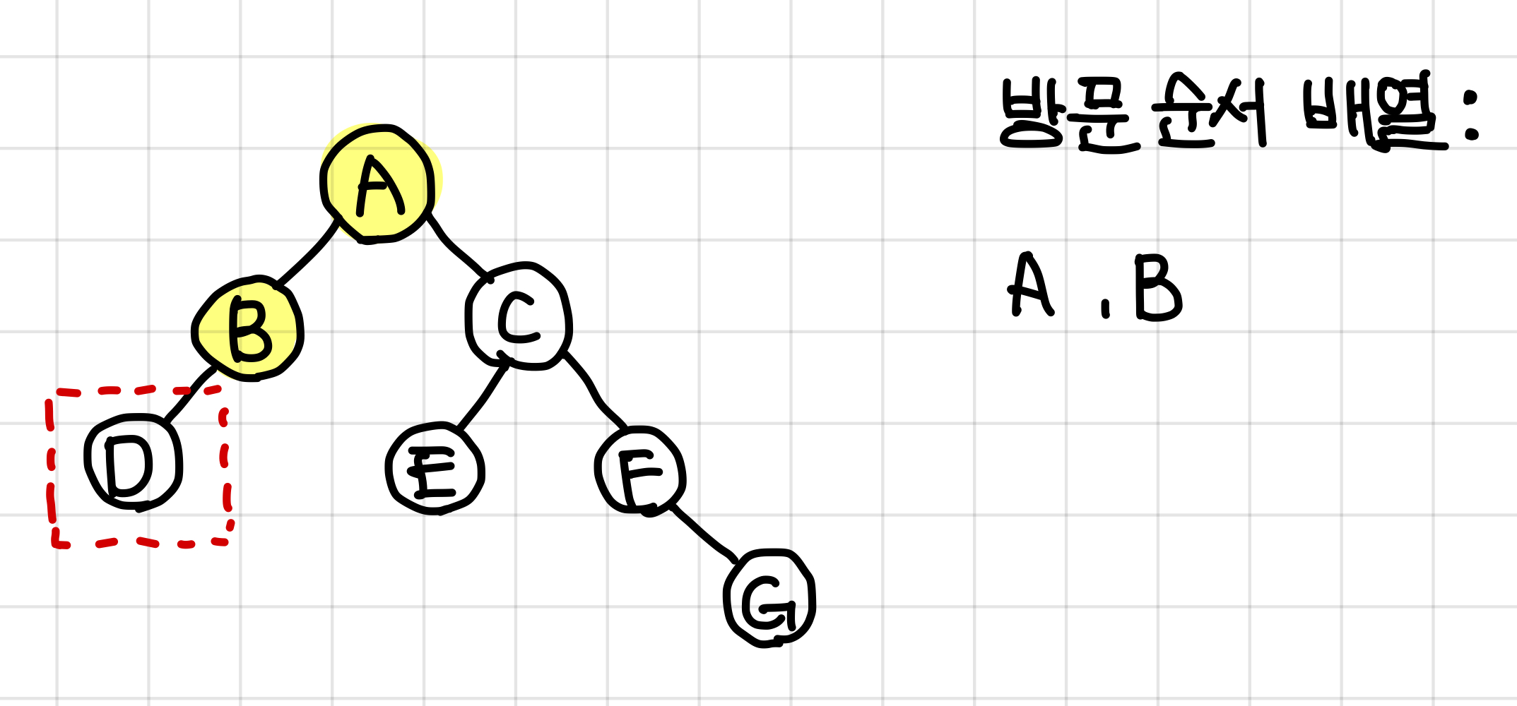 3. 왼쪽 노드인 B노드로 가기로 했으니까 B노드를 방문(탐색)하고, 방문한 B 노드를 방문 순서 배열에 넣어준다.