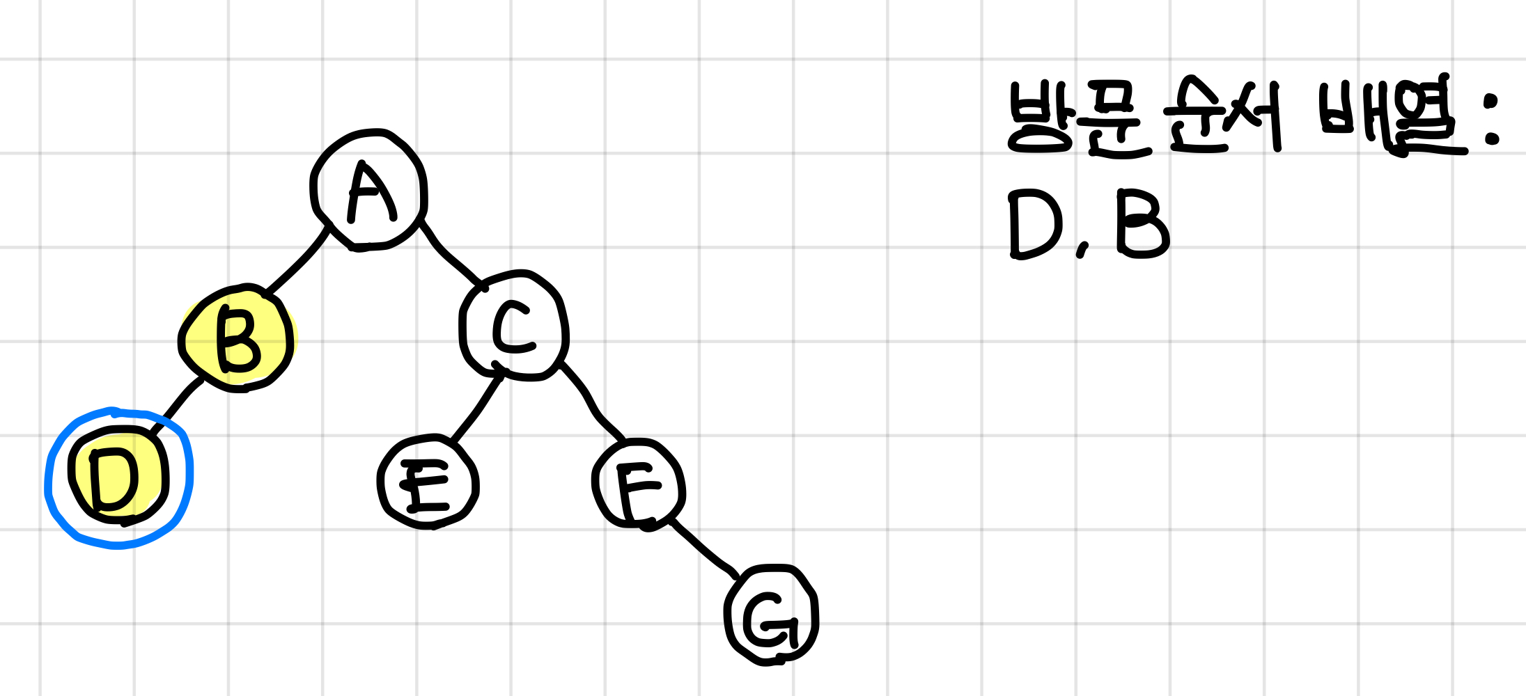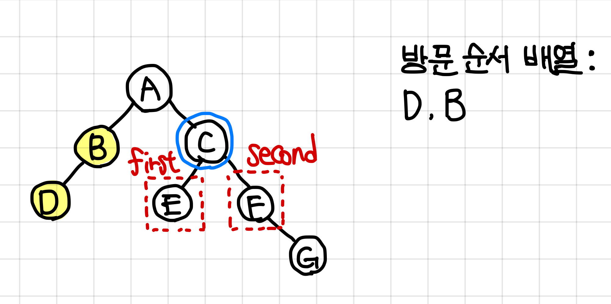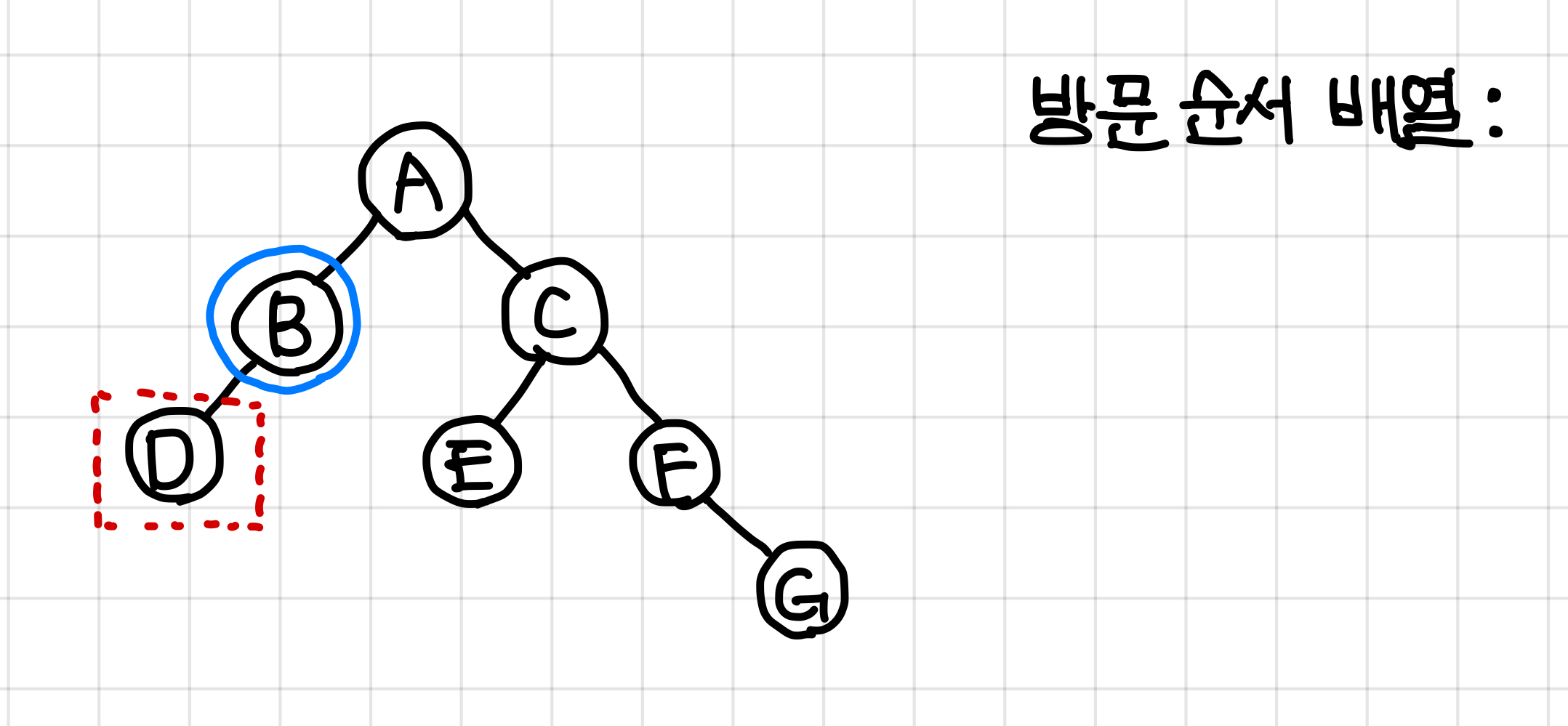 B 노드에는 오른쪽 노드가 없으므로 바로 다음 노드인 D노드로 가준다.