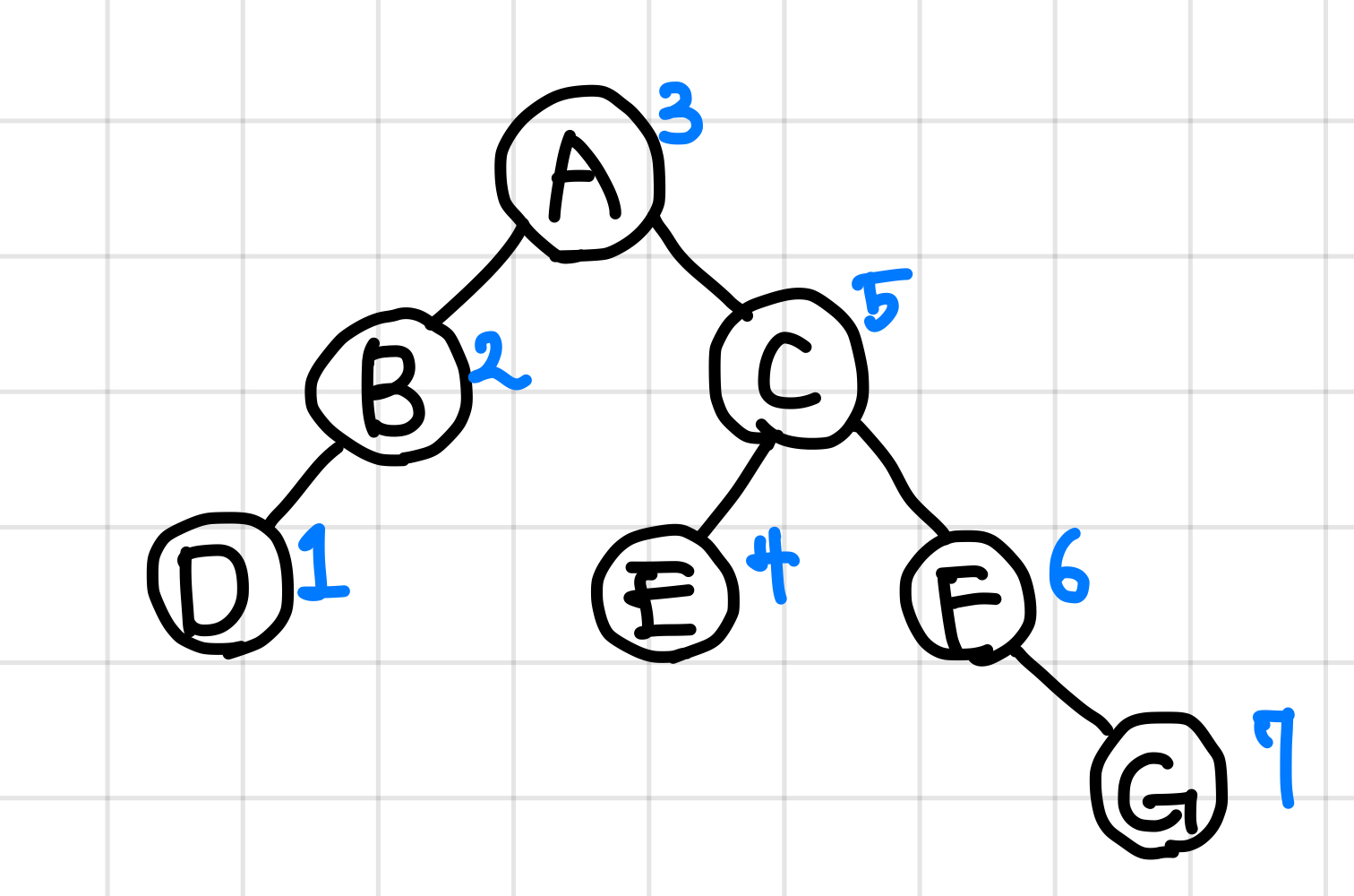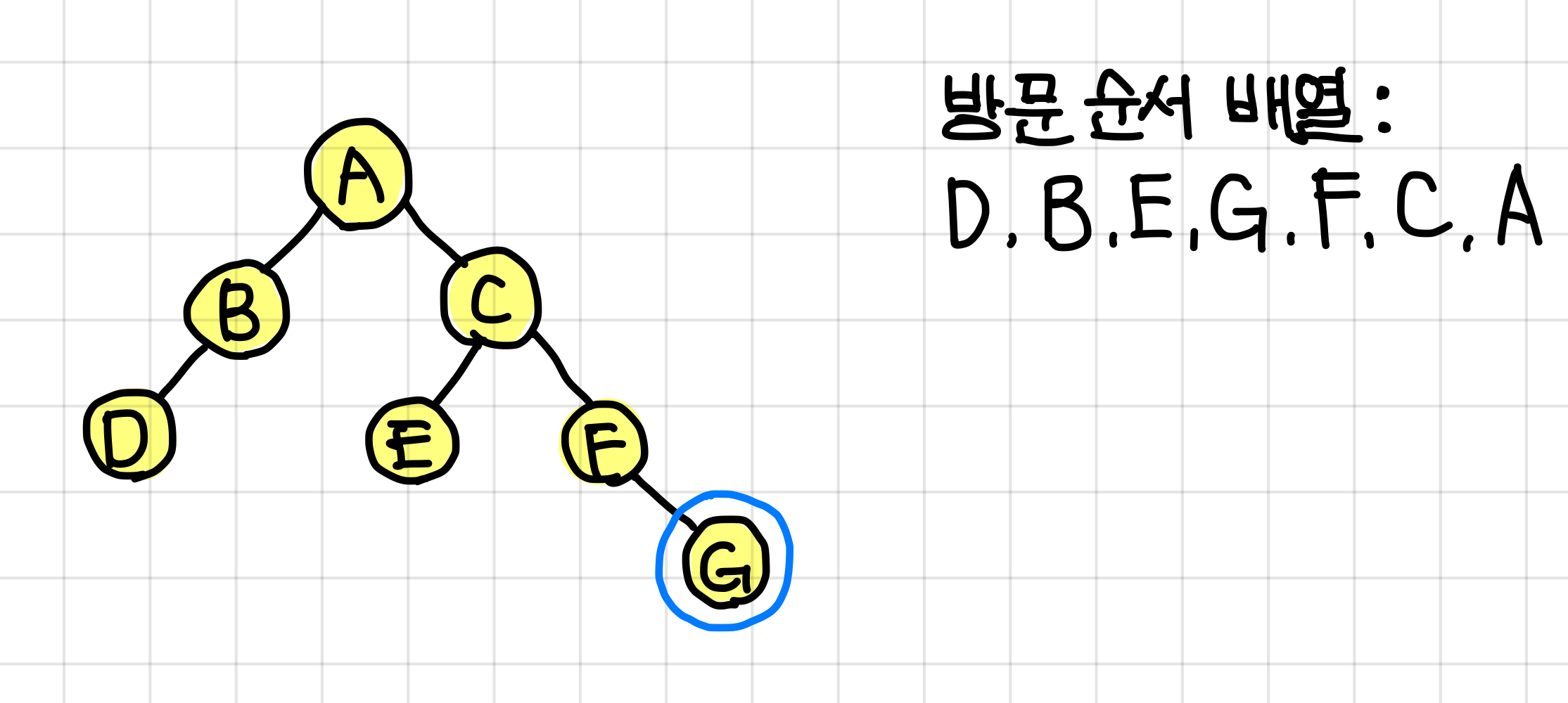 - 후위 순회한 결과 : DBEGFCA // (왼쪽 자식) (오른쪽 자식) (루트)