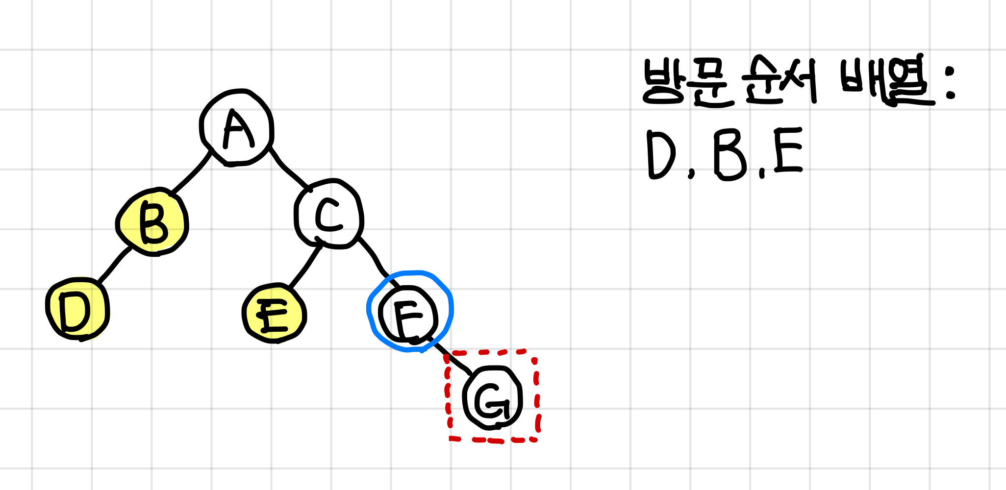 G 값이 들어감과 함께 F 노드의 오른쪽 dfs가 종료됐으므로, F 값도 들어간다.▼