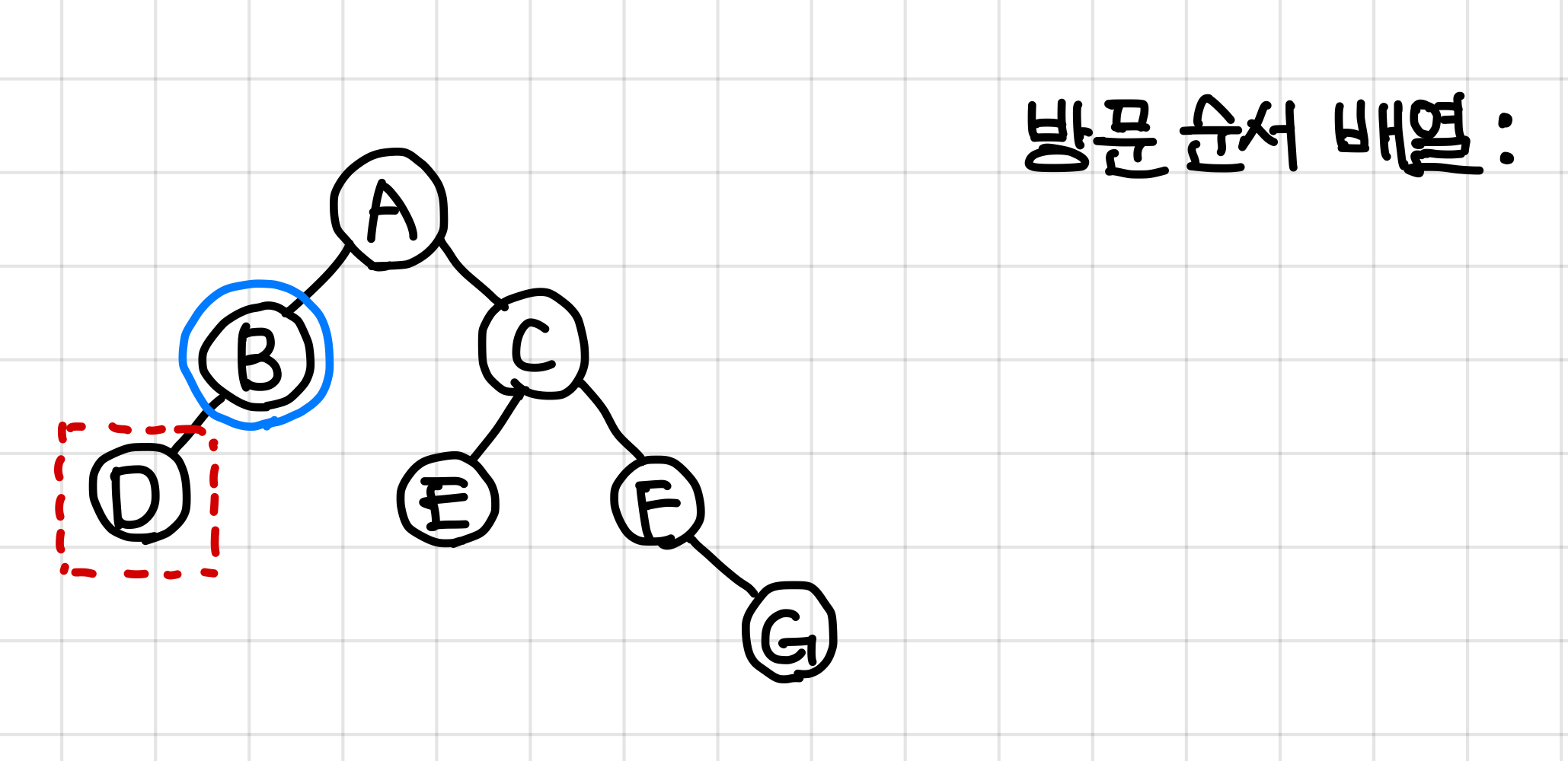 3. 왼쪽 노드인 B노드로 가기로 했으니까 B노드를 방문(탐색)하고, 방문한 B 노드를 방문 순서 배열에 넣어준다.
