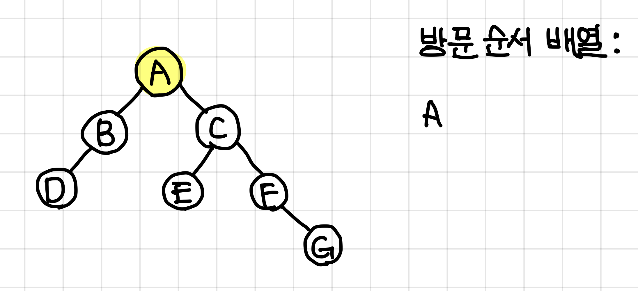 2. 왼쪽 부터 방문하기로 했으므로 A값은 왼쪽 dfs가 전부 끝나고 방문 순서 배열에 들어간다.