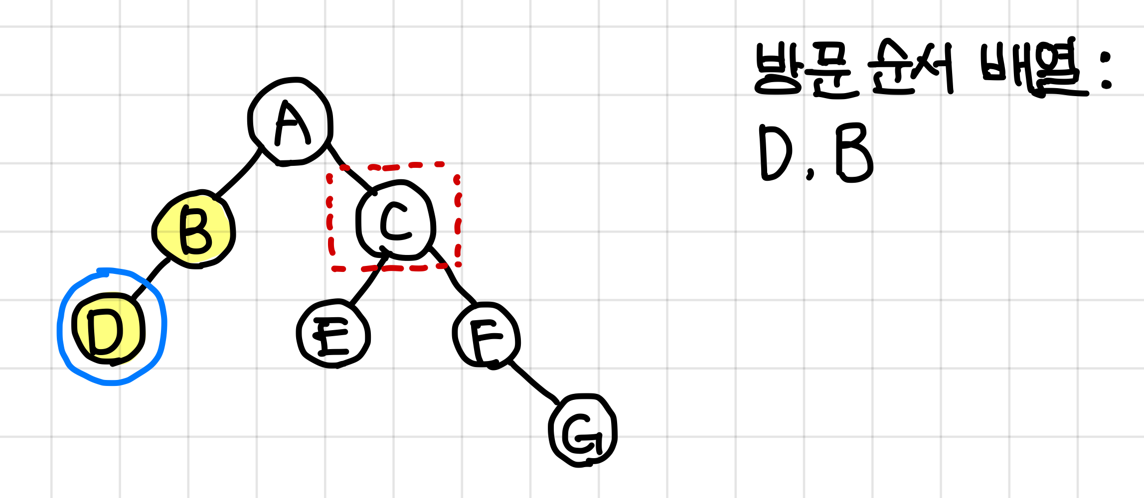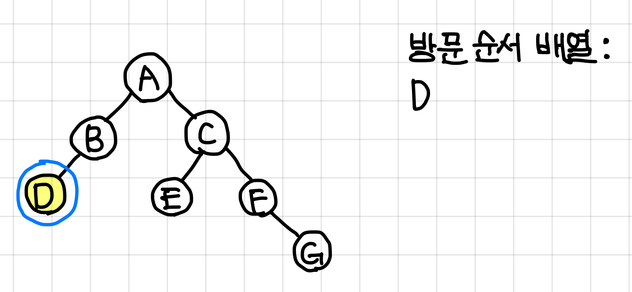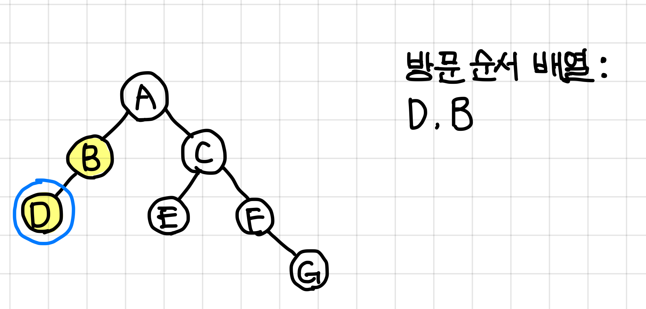B 노드에는 오른쪽 노드가 없으므로 바로 다음 노드인 D노드로 가준다.