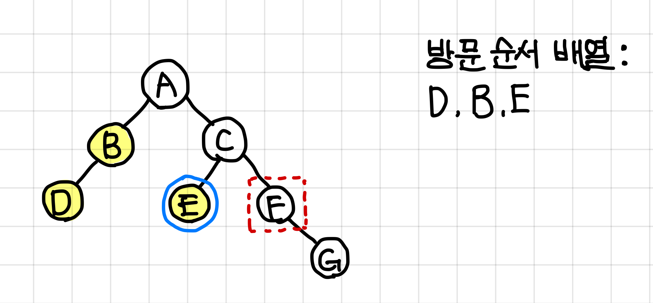 - 중위 순회한 결과 : DBAECFG // (왼쪽 자식) (루트) (오른쪽 자식)