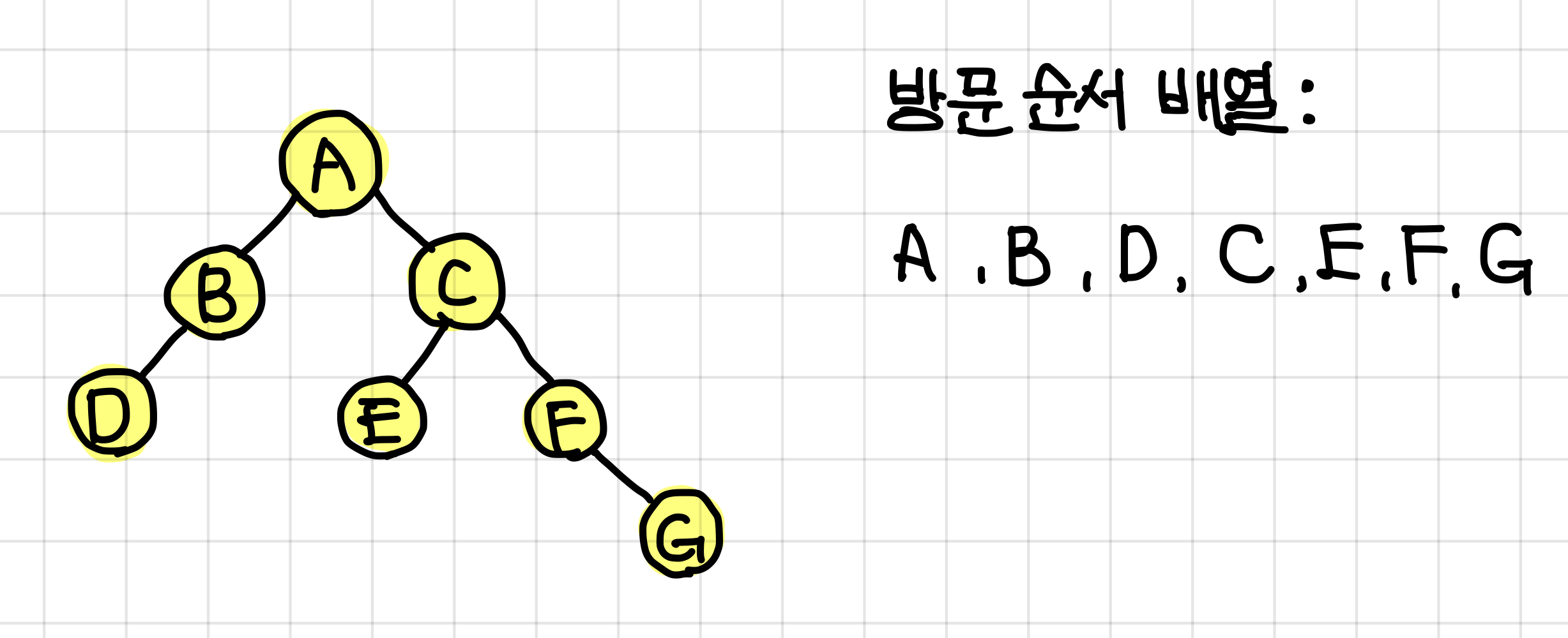 - 전위 순회한 결과 : ABDCEFG // (루트) (왼쪽 자식) (오른쪽 자식)
