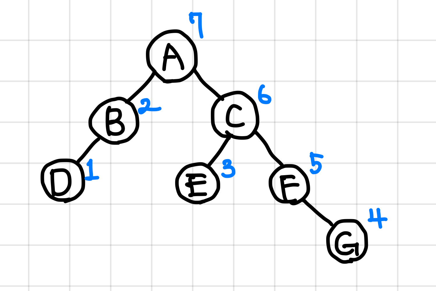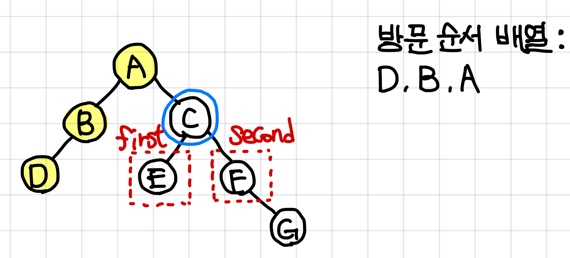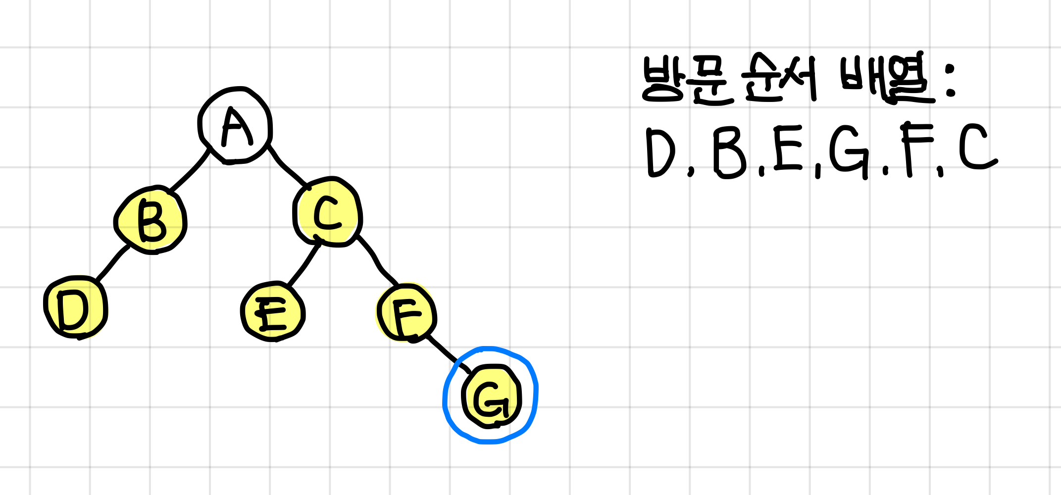 - 후위 순회한 결과 : DBEGFCA // (왼쪽 자식) (오른쪽 자식) (루트)