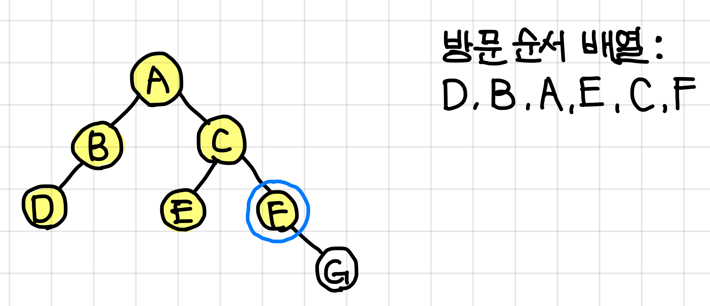 G 값이 들어감과 함께 F 노드의 오른쪽 dfs가 종료됐으므로, F 값도 들어간다.▼