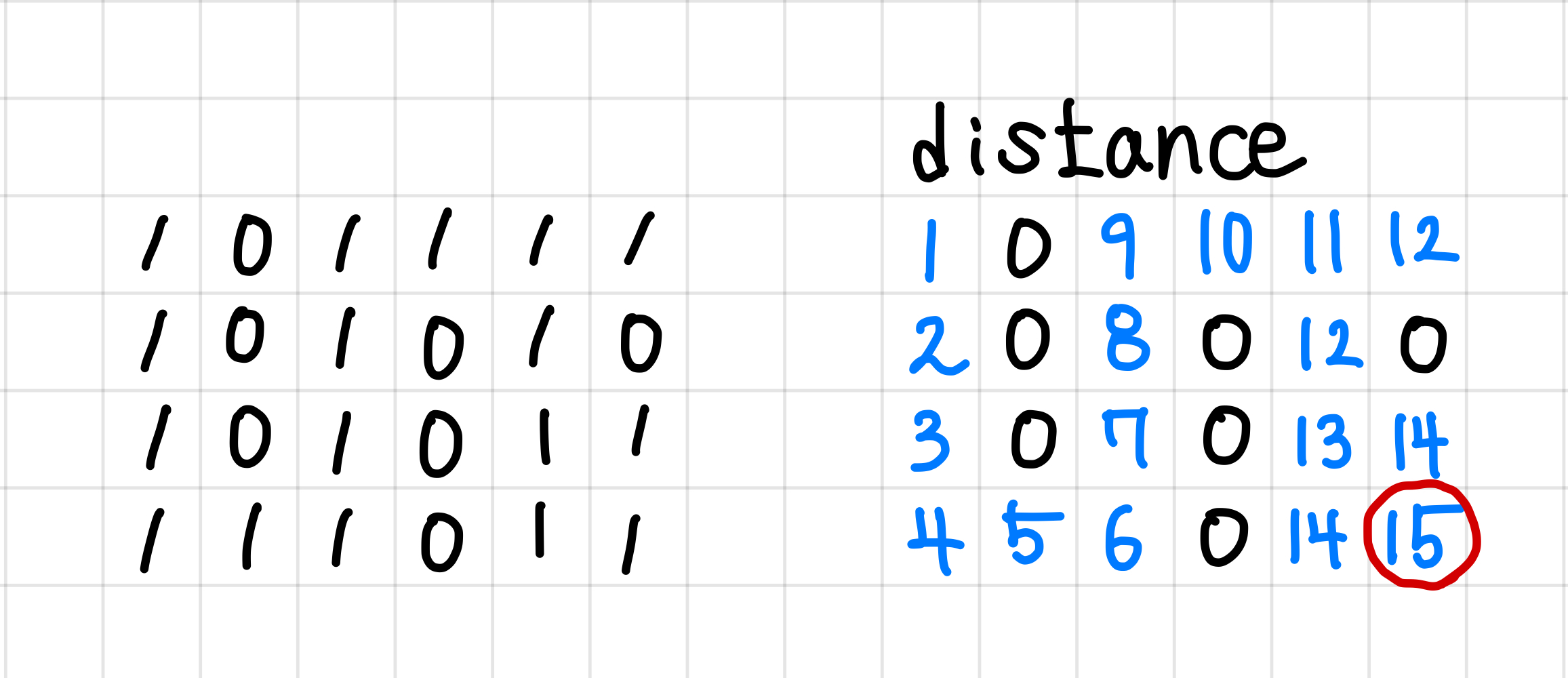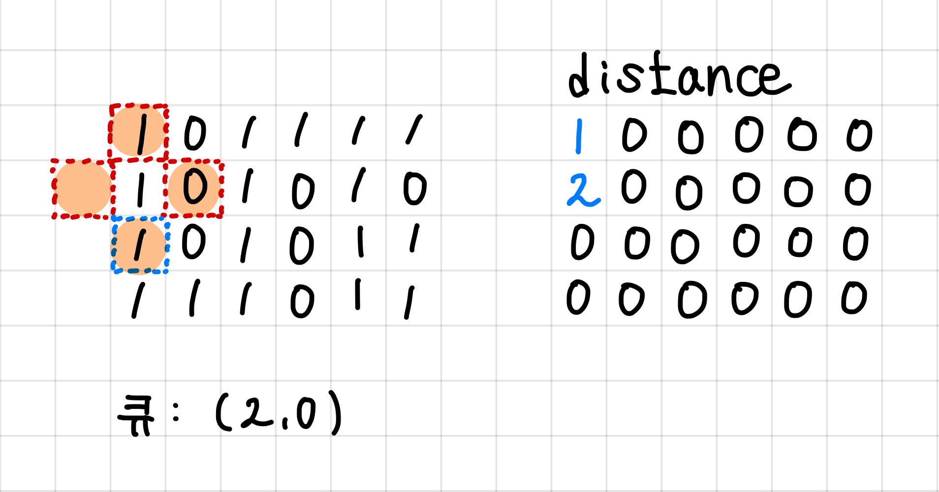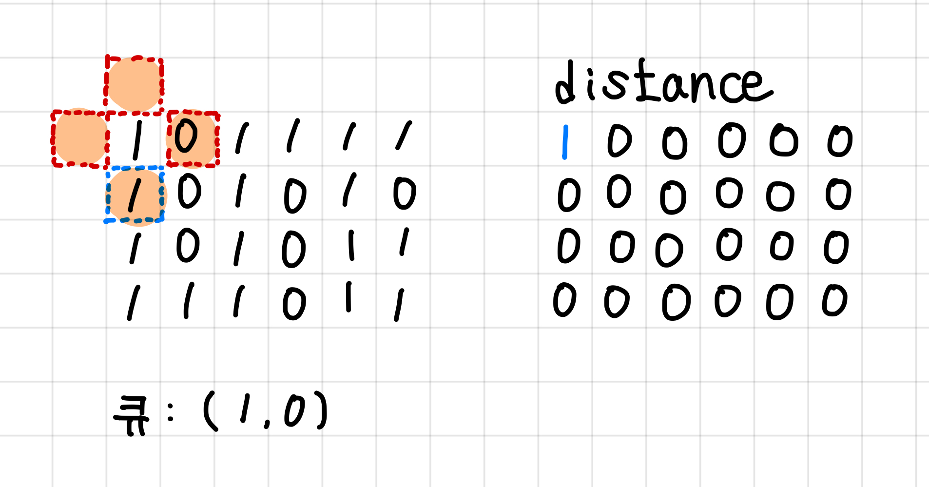 (0, 0)은 `distance` 값이 `1`이므로 이미 방문한 곳이라 더 이상 방문해주지 않는다. ▼
