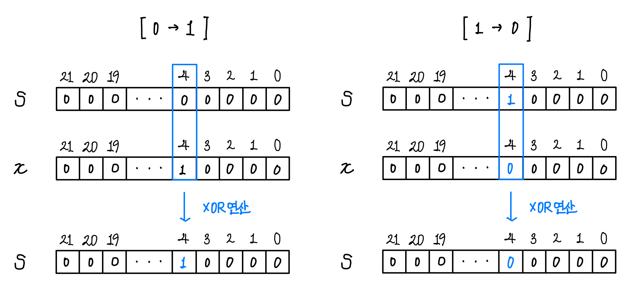 - toggle x: S에 x가 있으면 x를 제거하고, 없으면 x를 추가한다. (1 ≤ x ≤ 20)