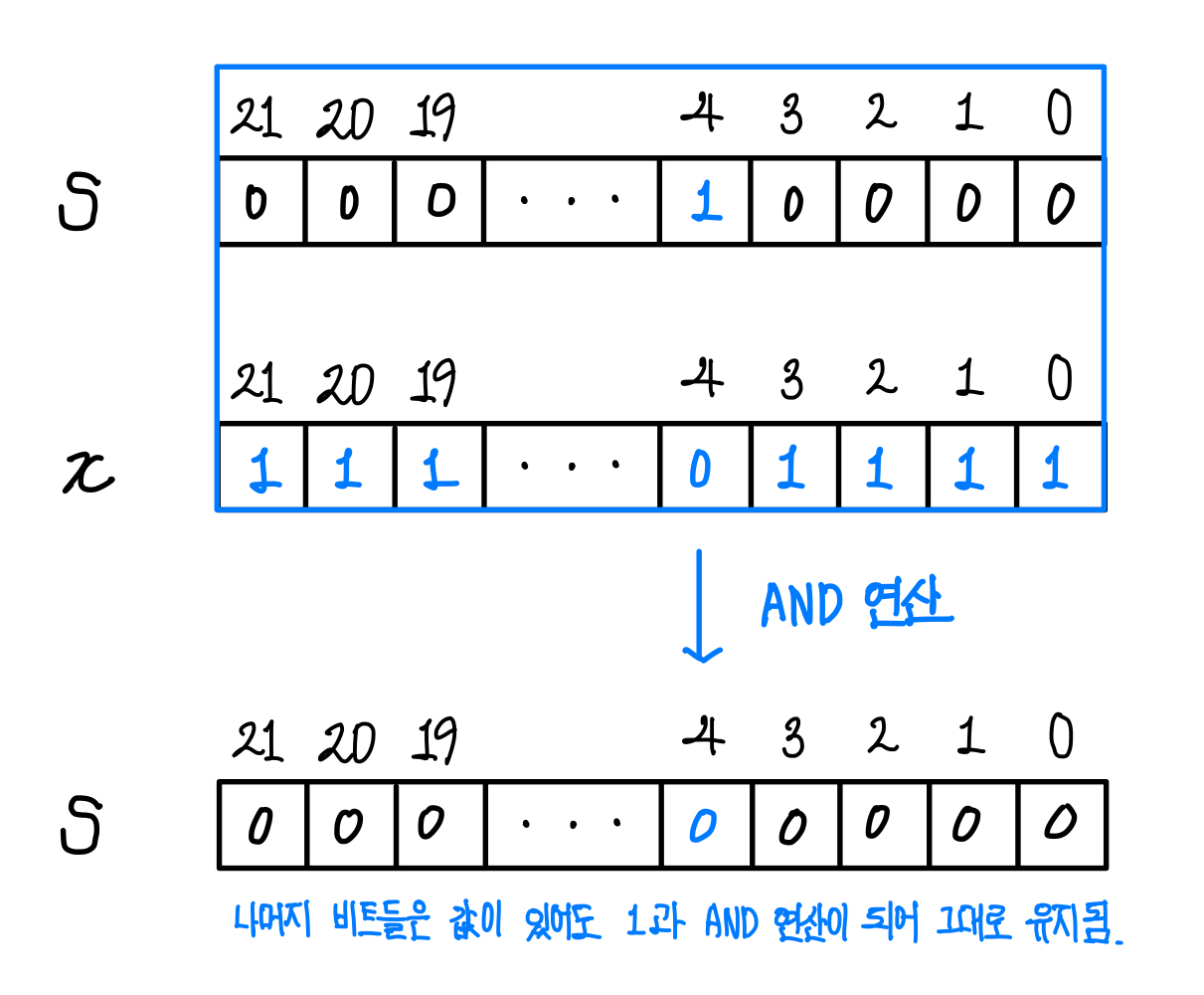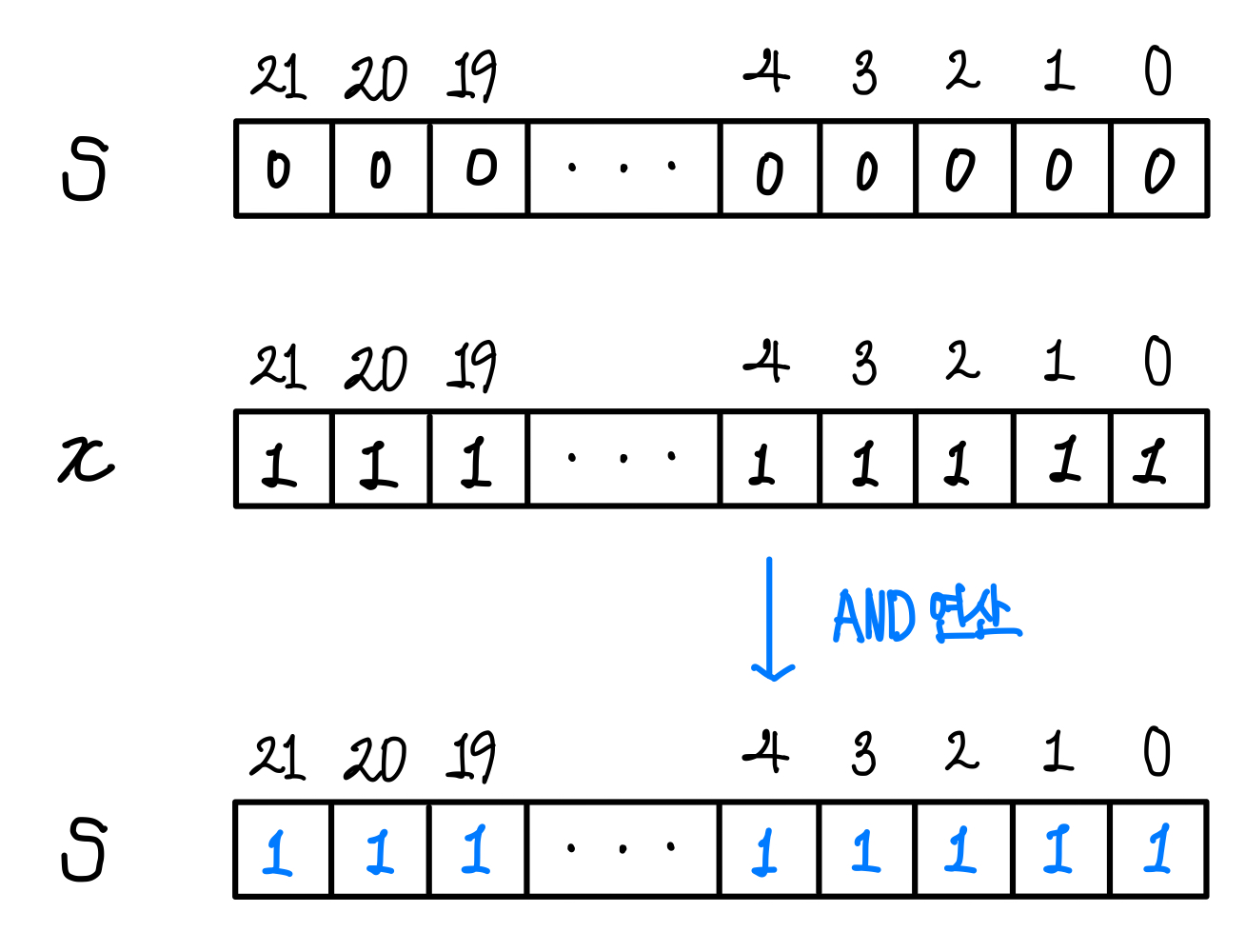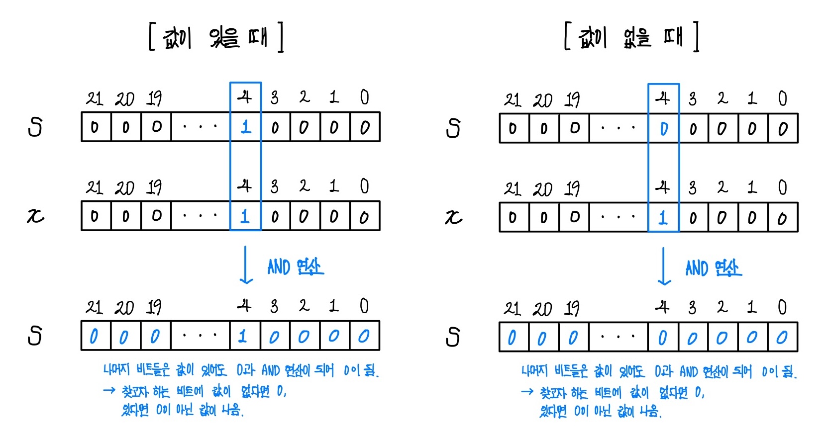 - check x: S에 x가 있으면 1을, 없으면 0을 출력한다. (1 ≤ x ≤ 20)