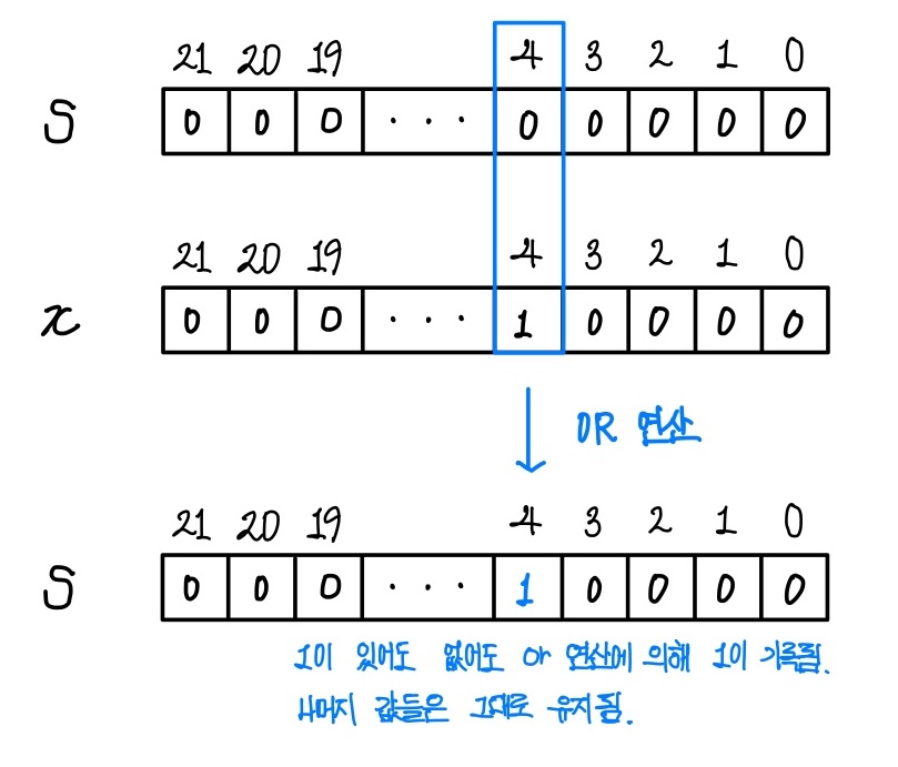- add x: S에 x를 추가한다. (1 ≤ x ≤ 20) S에 x가 이미 있는 경우에는 연산을 무시한다.