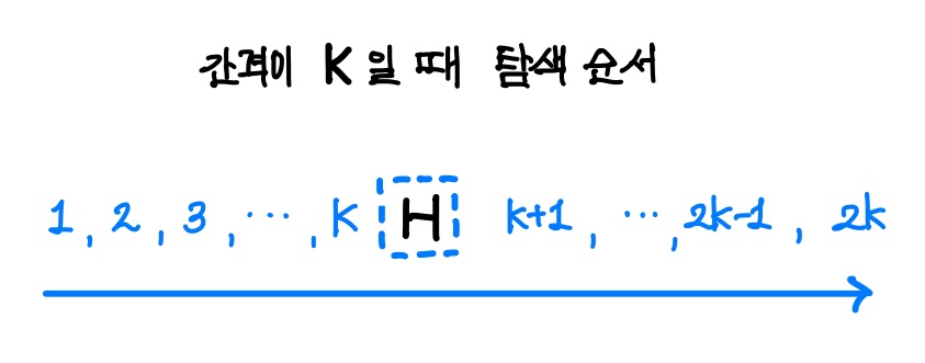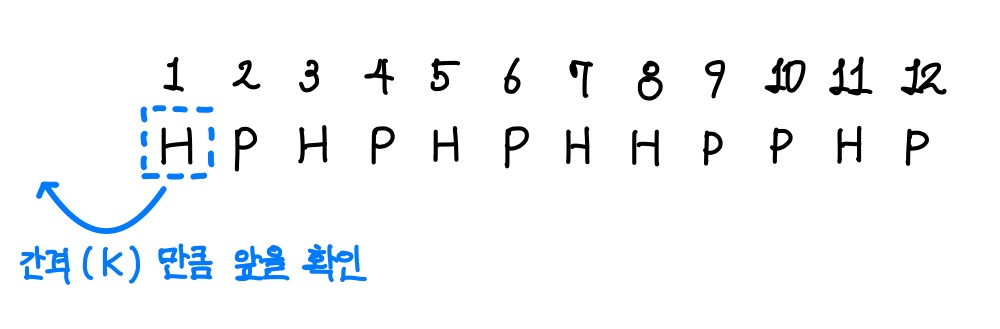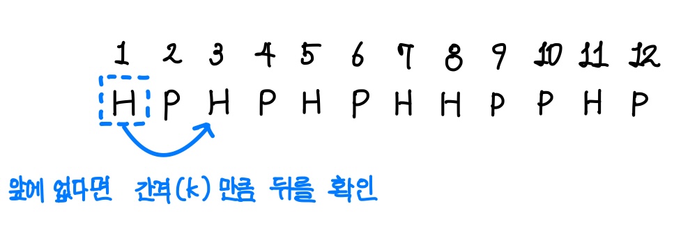 쭉 순회를 시작하다가, H가 나오면 우선 간격, K 만큼 앞을 확인해본다.
