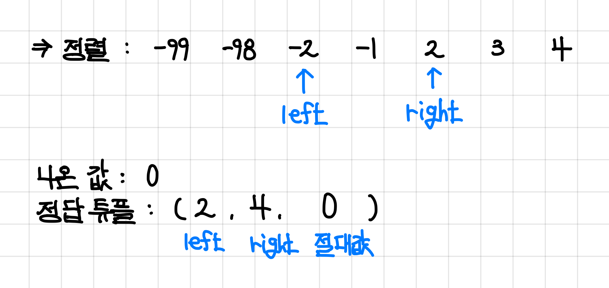 나온 값이 0보다 작았으므로, 다음에 더했을 때의 값을 좀 더 키워주기 위해 left 포인터 값을 하나 늘려준다.▼