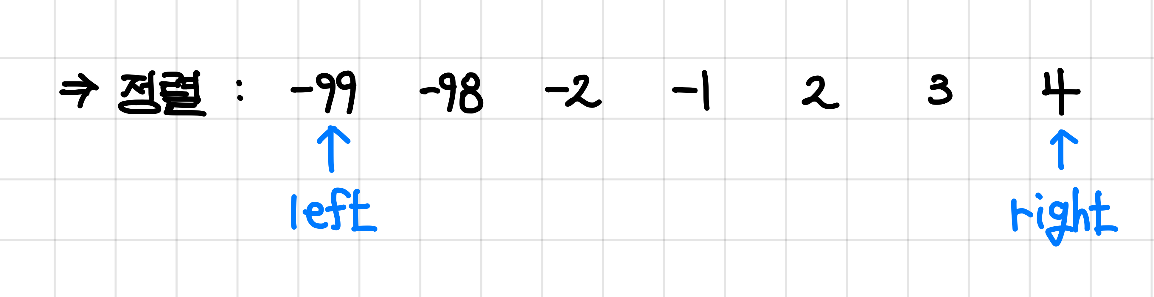 2. 정렬된 배열의 가장 왼쪽을 left포인터, 가장 오른쪽을 right 포인터로 두 포인터를 설정해준다.▼