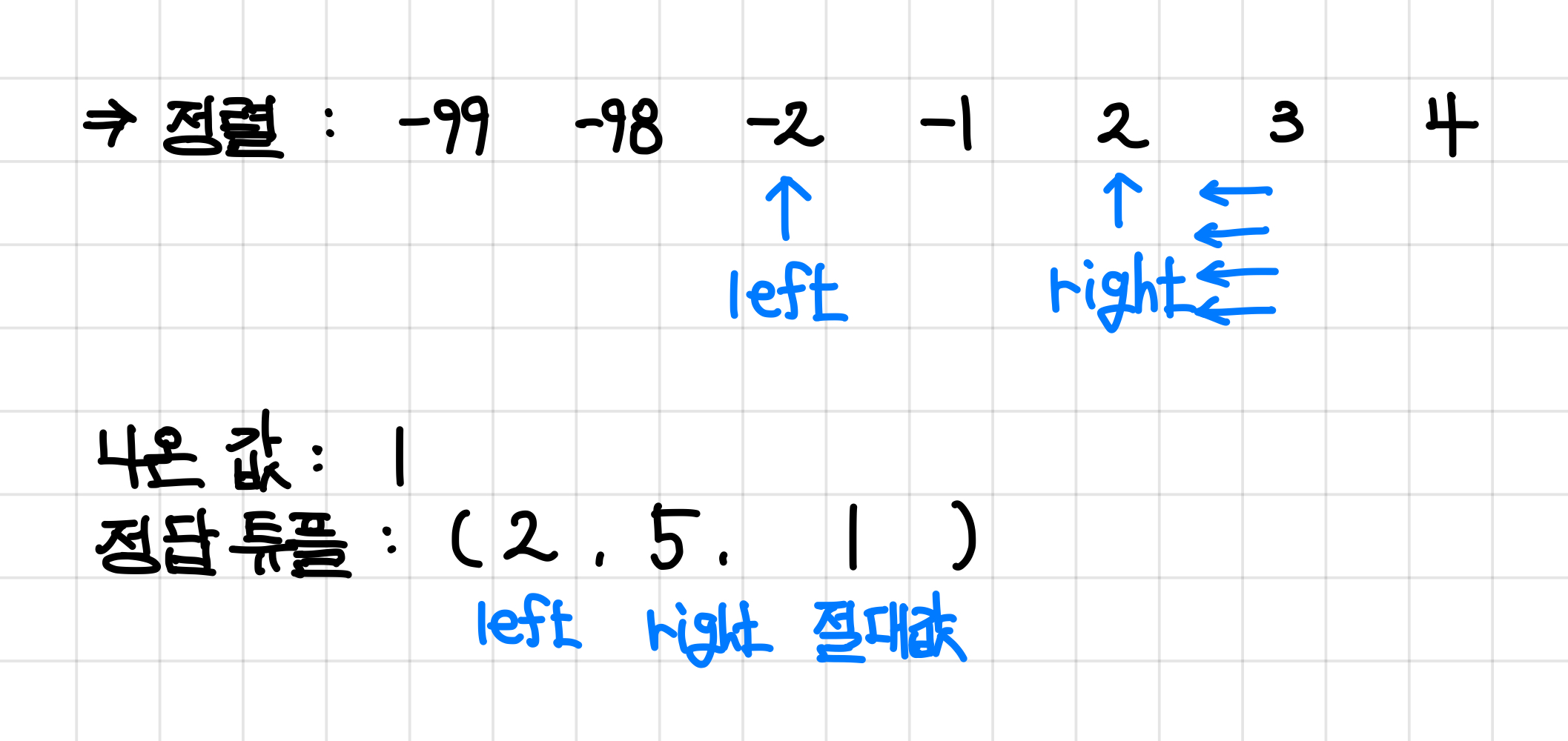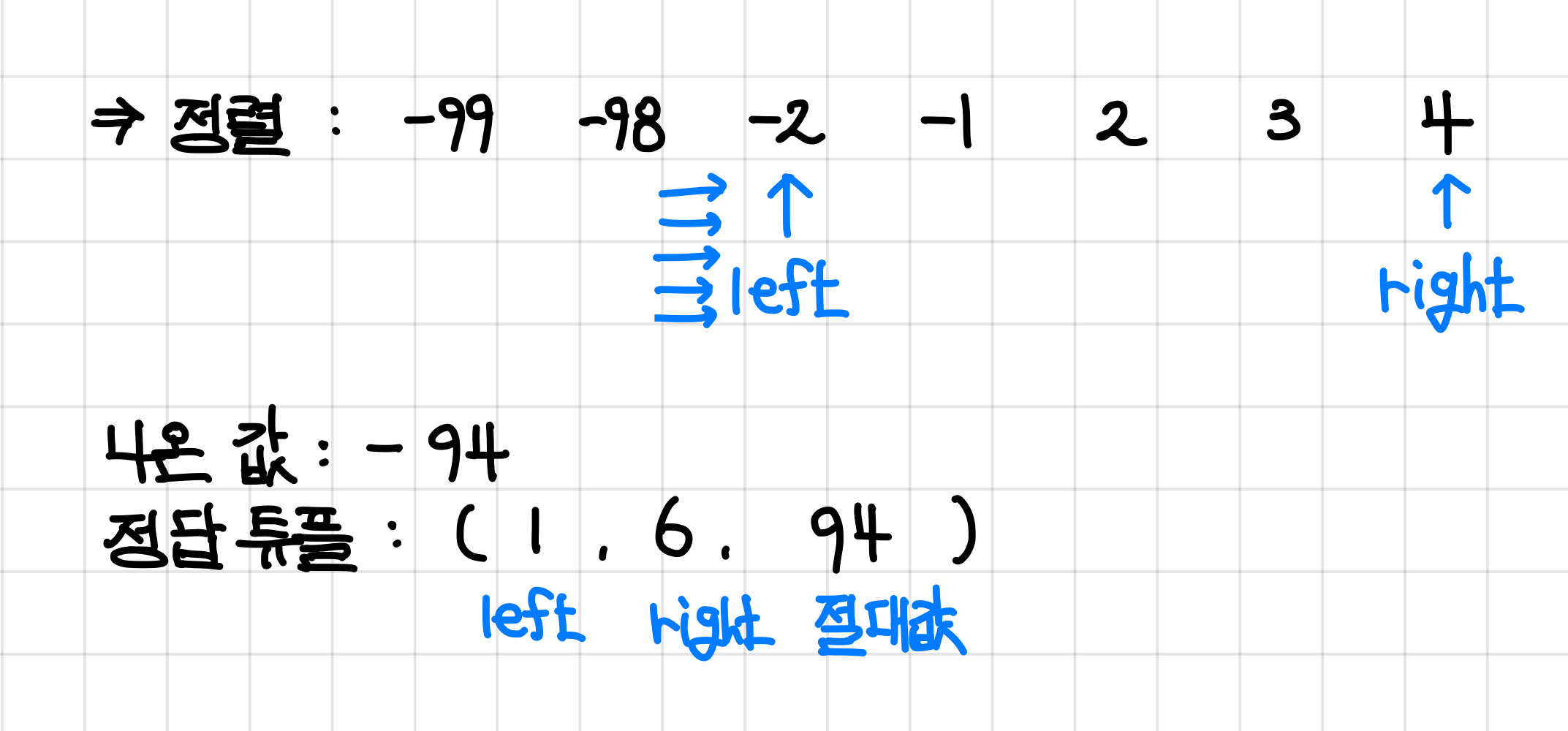 나온 값이 0보다 작았으므로, 다음에 더했을 때의 값을 좀 더 키워주기 위해 left 포인터 값을 하나 늘려준다.▼