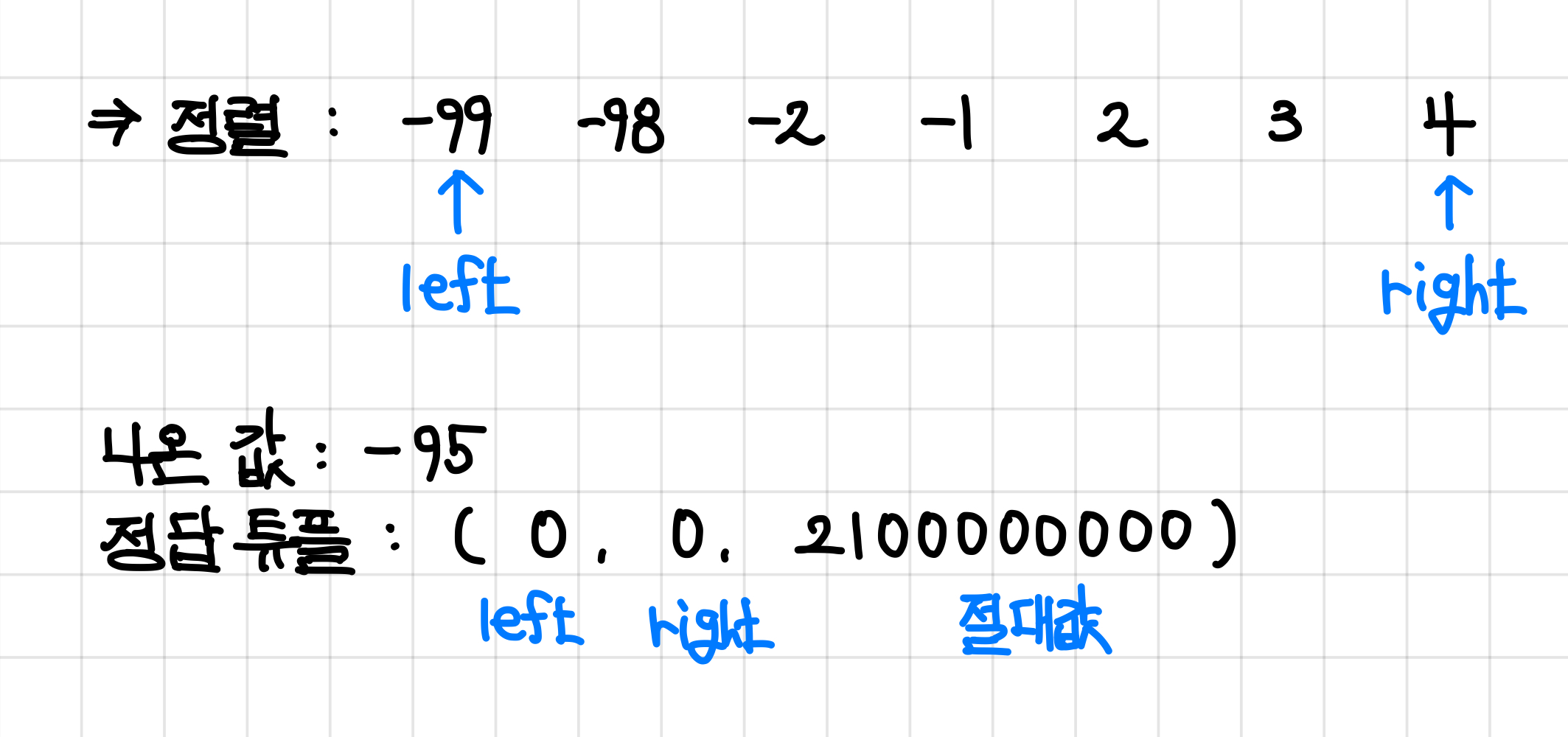 하지만 우리는 0에 가장 가까운 두 값의 합을 구하는 것이기 때문에, 구간의 합을 구하는 방식과는 다르게 구현해야한다.