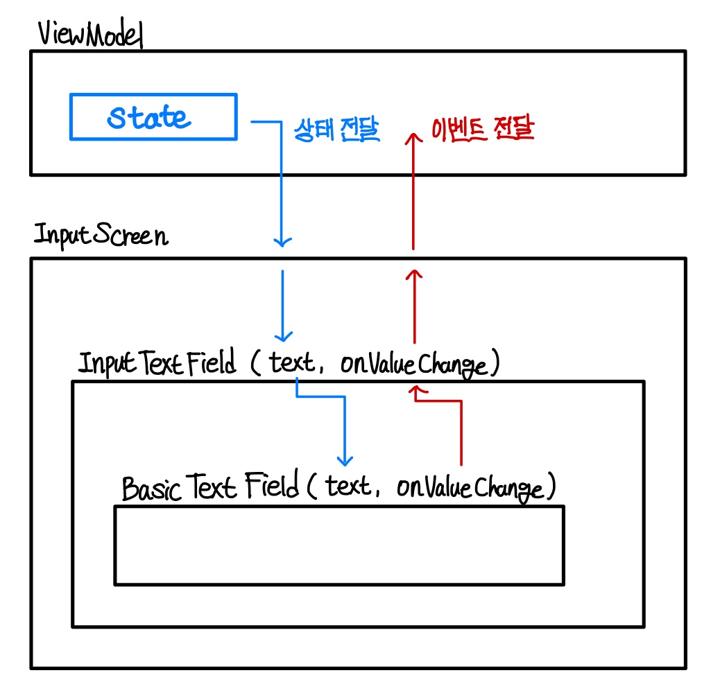 상태를 위로(Input Screen으로) 올리는 State Hoisting을 하게되면 상태와 이벤트(onValueChange)는 아래와 같은 구조로 전달이 된다. ▼