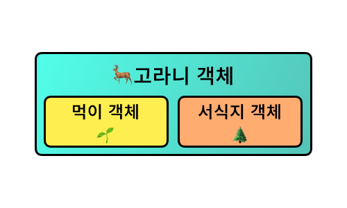 왼쪽 그림과 같이 고라니 객체가 있다고 했을 때, 고라니 객체 안에 먹이 객체와 서식지 객체를 두게 되면 이는 고라니 객체가 먹이, 서식지 객체를 참조한다고 하며 의존관계로 표현된다.