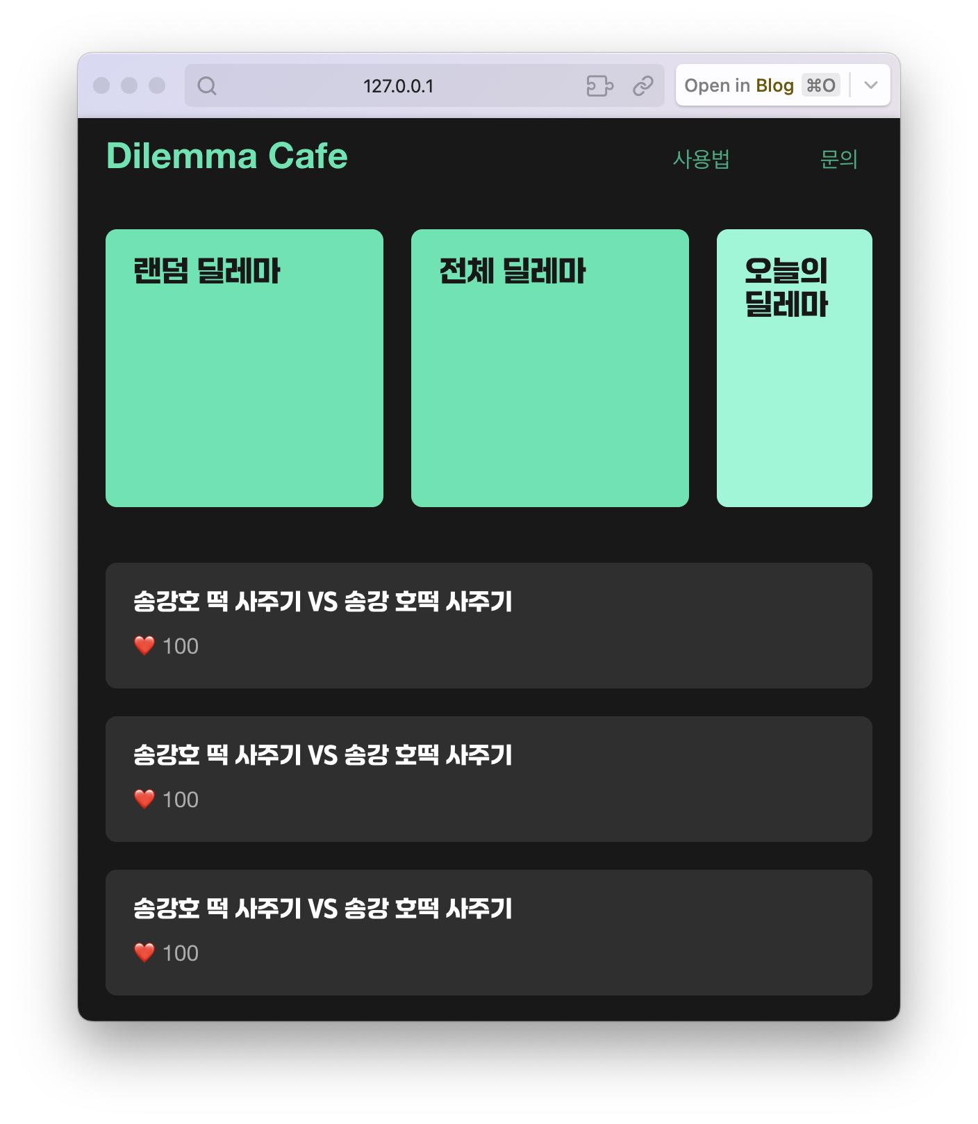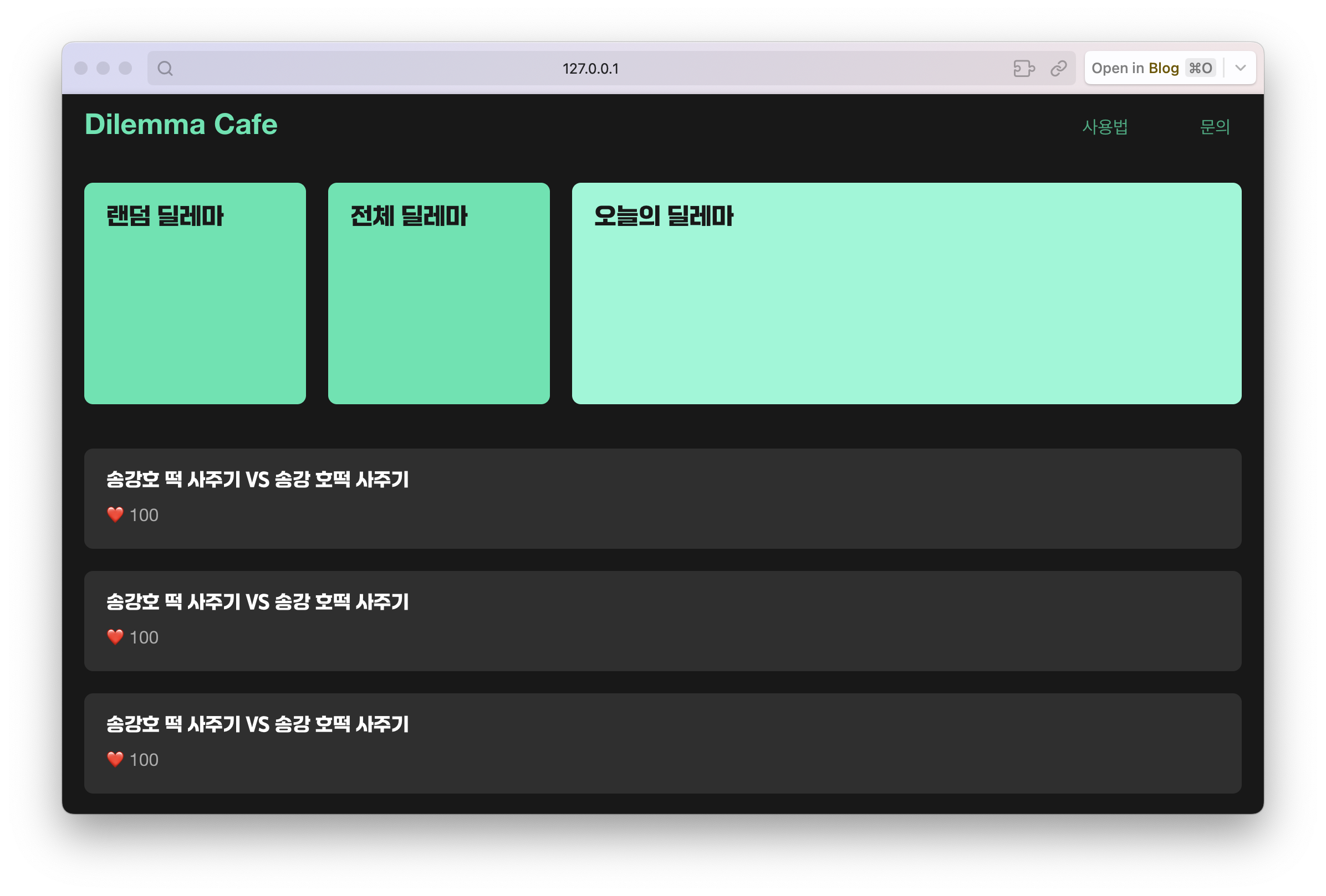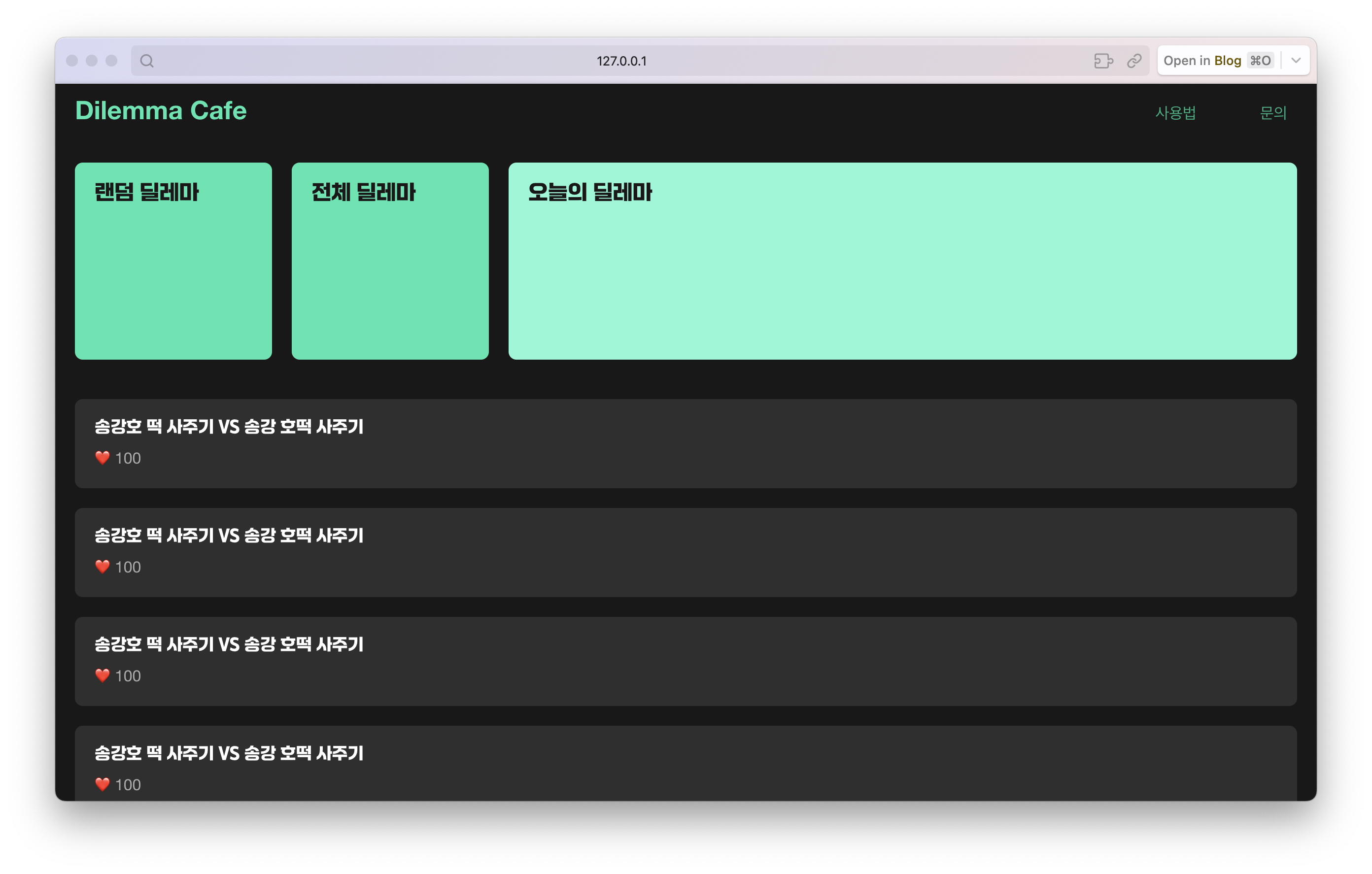 아래의 웹 사이트가 내가 대강 만든 사이트 외관이다. 이런 형태로 제작이 될 거고, 왼쪽 상단에 있는 랜덤 딜레마와 전체 딜레마는 고정적으로 해당 위치에 있게 하려고 한다. 그리고 오늘의 딜레마는 나머지 공간을 다 사용하게 할 건데, 화면이 너무 줄어들게 되면 아래로 내릴 예정이다.