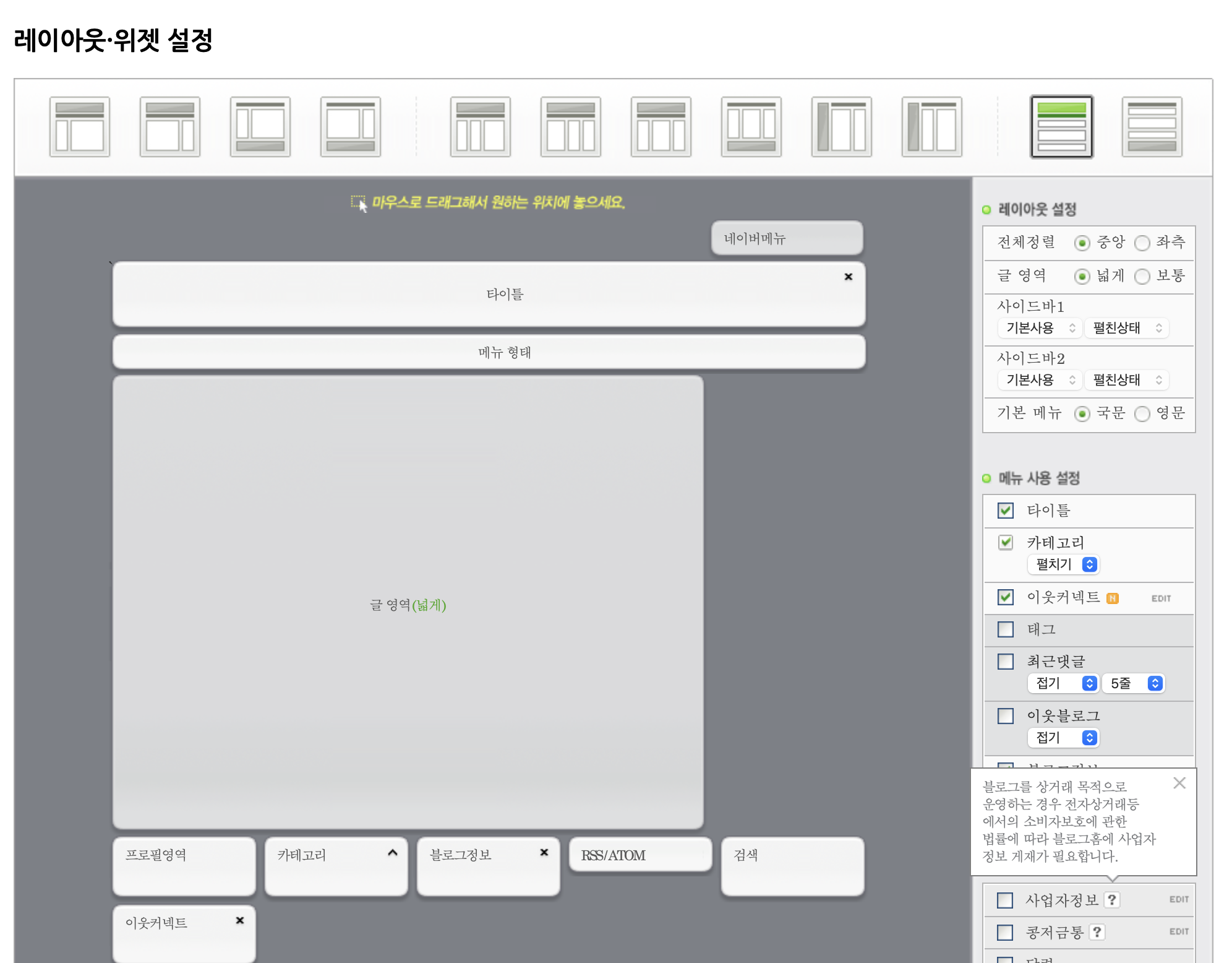 또한 아래의 그림과 같이 레이아웃도 원하는 대로 지정하여 블로그를 운영할 수 있다. 레이아웃에 위젯도 제공이 되어 위의 스킨과 마찬가지로 유저 공유 위젯을 사용하거나 직접 만들어 적용할 수 도 있다.