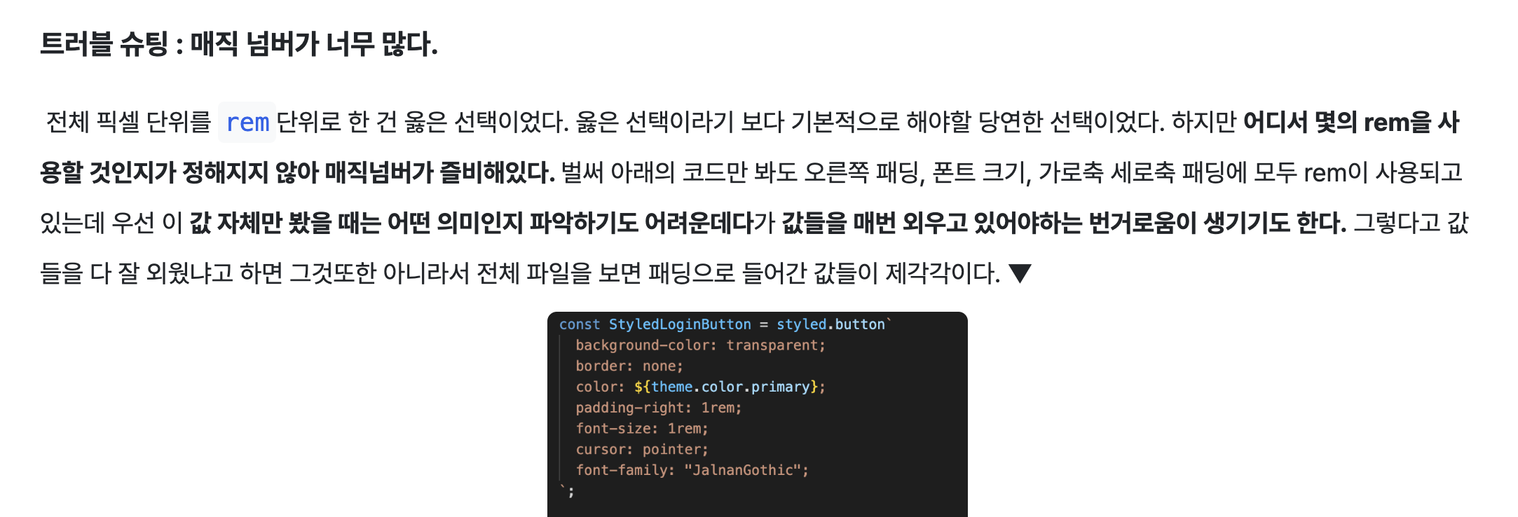 하지만 이런 문제점 역시 매직넘버를 없애면서 해결할 수 있다. 테마나 규격을 모두 다 정해놓고 필요한 상황에서 이를 사용하면 사이트 전체적으로 통일감 있게 UI를 구성할 수 있게 된다. 예를 들면, `body1Regular`라는 폰트 스타일을 `font-size: 1.2rem; font-family: \"Pretendard\";`로 정의해놓았다면 이후에 세부적인 내용을 기억하지 않아도 '아 이런 컴포넌트에서는 `body1Regular`를 적용하는게 좋지' 하고 적용할 수 있게 된다.